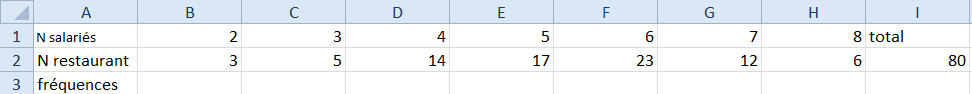 blandine fadat Posté(e) le 15 novembre 2014 Signaler Posté(e) le 15 novembre 2014 bonjour , j'aurais besoin d'aide pour ce devoir de math s'il vous plait ! une enquête a été réalisée dans des restaurants de Nîmes pour connaitre le nombre de leurs salariés. Le résultat de cette enquête est répertorié dans un tableur : 1)quelle formule a-t-on saisi dans la cellule i12 pour obtenir le nombre total de restaurants? 2)on souhaite calculer les frequences de chaque valeur. Pour cela que doit on saisir dans la cellule B3 afin de la recopier jusqu'en H3? 3)calculer la frequence de la valeur "4" salariés.donne le résultat sous forme décimale et en pourcentage. 4)calcule le nombre moyen d'employés dans ces restaurants. 5)calcule le nombre médian de salariés. que cela signifie t-il? 6)determine les premiers et troisieme quartiles. 7)peut on dire qu'au moins 25 pour cent des restaurants on moins de 4 employés? 8)calcule le pourcentage de restaurant ayant au moins 4 employés. merci