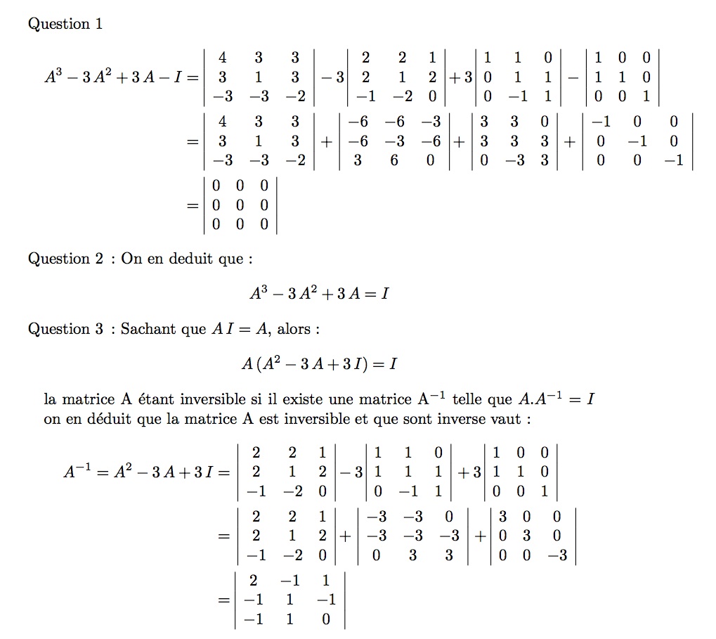 Abc1234 Posté(e) le 24 novembre 2014 Signaler Posté(e) le 24 novembre 2014 Bonjour pouvez vous m aidez c est pour demain svp Soit A la matrice: Soit A= 1 1 0 1 1 1 0 -1 1 On donne: A²= 2 2 1 2 1 2 -1 -2 0 et A^3= 4 3 3 3 1 3 -3 -3 -2 Question 1 Calculer A^3-3A²+3A-I où I est la matrice identite d'ordre 3 Question 2 En déduire A^3-3A²+3A Question 3 En déduire, par un calcul matriciel que A est inversible et donner une e