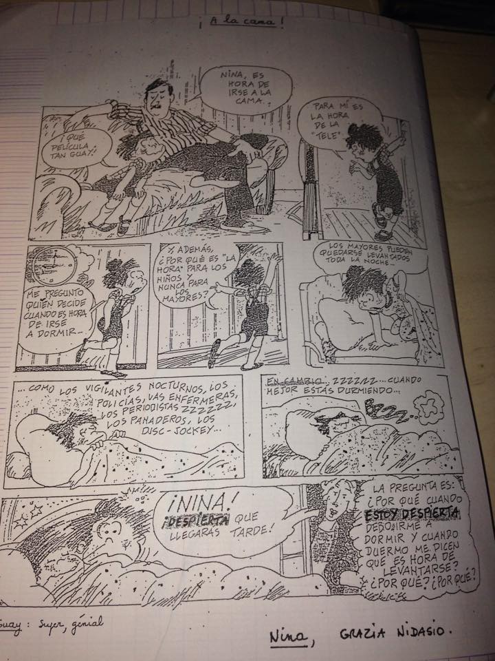 Inconnitus Posté(e) le 6 janvier 2015 Signaler Posté(e) le 6 janvier 2015 1) Nina debe irse a la cama porque su padre le ordena 3) Nina se queja de que cuando uno esta durmiendo le despiertan y cuando est despierta tiene que dormir Traduction 1)Nina doit alle au lit car son pere le lui ordonne 3) Nina se plein que quand elle est reveille elle doit alle dormir et quand elle dort elle doit se reveiller. PS la 2 je comprends pas