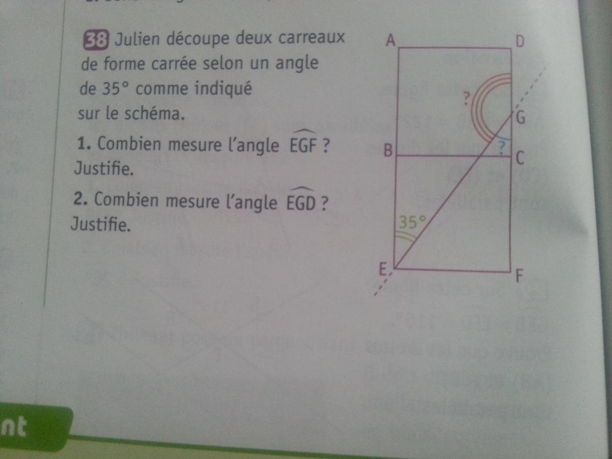 E-Bahut Barbidoux Posté(e) le 27 janvier 2015 E-Bahut Signaler Posté(e) le 27 janvier 2015 Utilise les proportions 10 ---->? 25 --->19.5 ==> 10/25=?/19,5 ==> ?=19.5*10/25=7.8 L ------------------- 8 —> ? 5.75 —> 3.45 ==> 8/5.75=?/3.45 ==> ?=3.45*8/5.75=4.8 kg 38————————— Angle alterné interne EGF=GEB=35° ———— Angle EGD=Angle FCD-Angle FGE=180-35=145°