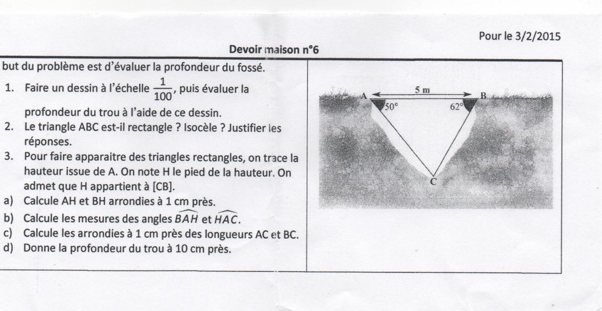 blandine fadat Posté(e) le 29 janvier 2015 Signaler Posté(e) le 29 janvier 2015 bonjour j'aurais besoin d'aide pour un dm s'il vous plait je sais pas comment faire pour le 1 pour le deux il n'est ni restangle ni isocele pour le 3 j'ai commence le a abh=62 ah=opposé ab=5=hypothenuse donc j'applique sinus pour bh abh=62 bh=adjacent ab=hypothenuse donc cosinus aprés je sais plus merci d'avance pour votre aide