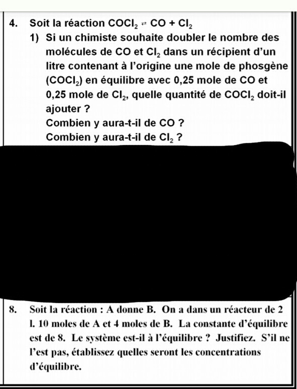 CiB Posté(e) le 1 février 2015 Signaler Posté(e) le 1 février 2015 Bonjour, j'ai un petit soucis pour deux petites questions. Elles ne sont pas très compliquées mais je suis bloquée, je n'arrive pas à avavancer. Pour le 4. J'ai ça : COCl_2 <-> CO + Cl_2 t=....1........0......0 t=eq..0,75....0,25...0,25 Mais on double le nombre de molécules de CO et Cl_2 Donc t=eq..0,5.....0,5....0,5 ? Pour le 8. A <-> B t=0.10.....4 Où Kc = /[A] = 8 --> volume = 2L --> [b/2]/[A/2] = 8
