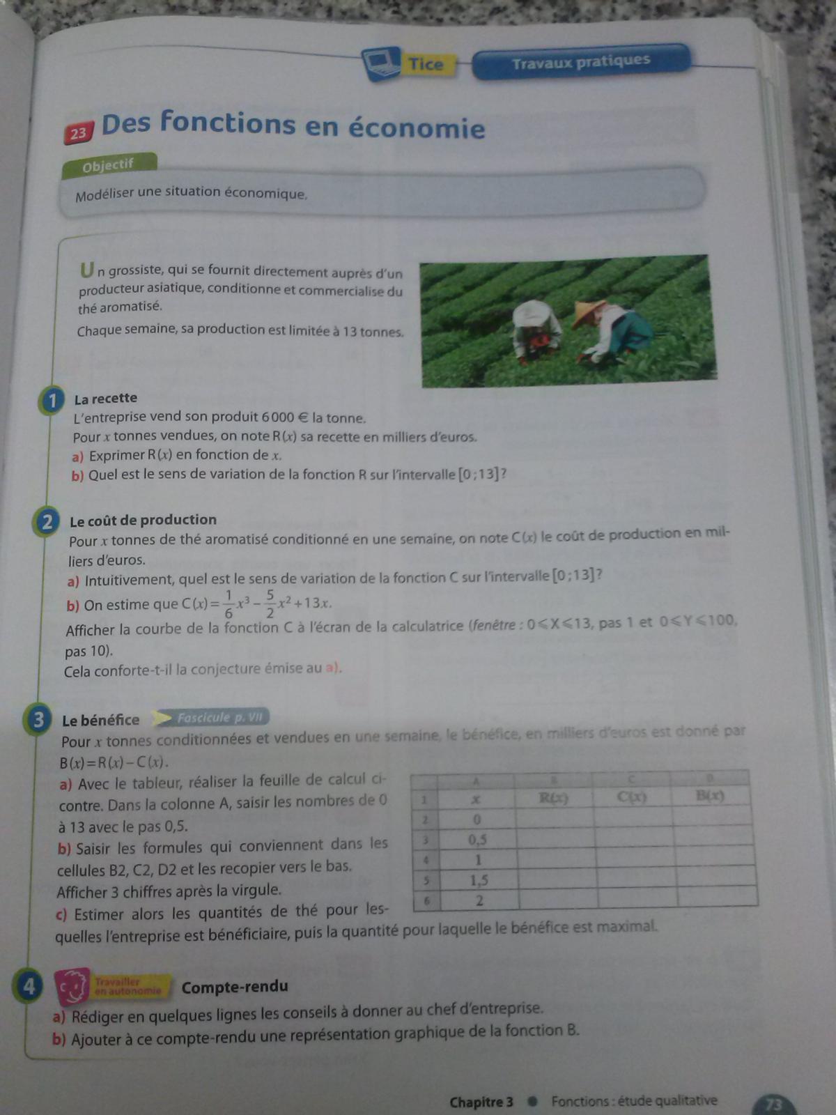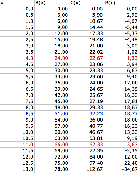 E-Bahut Barbidoux Posté(e) le 13 février 2015 E-Bahut Signaler Posté(e) le 13 février 2015 1———————— R(x)=6*x fonction croissante sur [0,13] 2——————— C(x) est croisante 3——————— B(x)=R(x)-C(x)
