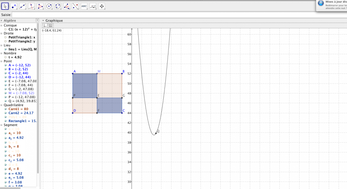 MicKeY- Posté(e) le 15 février 2015 Signaler Posté(e) le 15 février 2015 bonjour , j'ai fait un DM sur géogébra la partie construction je m'en sort bien Mais la partie Questions je n'y arrive pas , voici les questions : Lecture graphique ( A faire sur une feuille ) 1. Pour quelle valeur tMax de t l’aire de la partie bleue est-elle maximale? 2. Pour quelle valeur tMin de t l’aire de la partie bleue est-elle minimale? 3. Lire graphiquement l’aire de la partie bleue si t = 2. 4. Lire graphiquement la longueur AM sachant que l’aire de la partie bleue est 50. Et voici ma construction : Fichier joint :