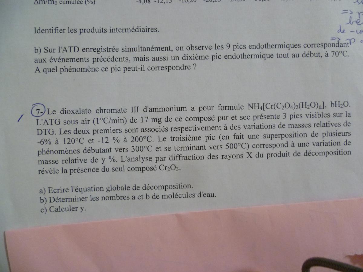 E-Bahut Barbidoux Posté(e) le 24 février 2015 E-Bahut Signaler Posté(e) le 24 février 2015 NH4[Cr(C2O4)2(H2O)a],bH2O Première déshydratation à 120° : NH4[Cr(C2O4)2(H2O)a],bH2O -> NH4[Cr(C2O4)2(H2O)a]+b*H2O variation de masse 1=Vm1 = 17*b/(246+17*(a+b)) seconde à 220° NH4[Cr(C2O4)2(H2O)a]—> NH4[Cr(C2O4)2]+a*H2O variation de masse 2 =Vm2 = 17*a/(246+17*a) phase finale : NH4[Cr(C2O4)2] —> (1/2)*Cr2O3+….. variation de masse 3=Vm3 = (M(NH4[Cr(C2O4)2])-M(Cr2O3)/2)/(M(NH4[Cr(C2O4)2])=Vm3=(246-152/2)/246=0.69=69% ————————— M(NH4[Cr(C2O4)2])=14+4+52+(12*2+4*16)*2=246 g/mol M(Cr2O3)=52*2+3*16=152 g/mol ——— Vm2 = 17*a/(246+17*a)=0.12 ==> a= 1.97 ≈2 Vm1= 17*b/(246+17*(1.97+b)=0.06 ==> b=1.05