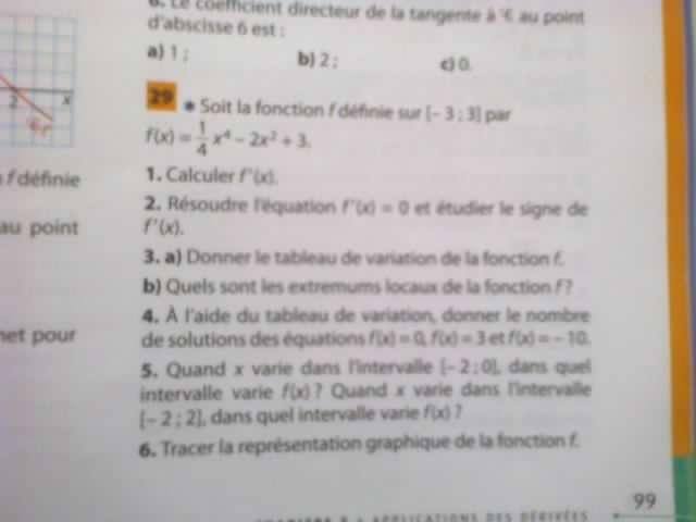 reya Posté(e) le 20 février 2015 Signaler Posté(e) le 20 février 2015 J'ai fais le 1) et 2) : f(x) = 1/4 x⁴ - 2x² + 3 f'(x) = x³ - 4x f'(x) = 0 x (x² - 4) = 0 soit x = 0 soit x = 2 soit x = -2 mais le reste ......