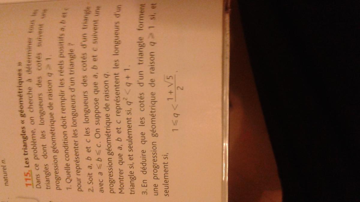 E-Bahut Barbidoux Posté(e) le 10 mars 2015 E-Bahut Signaler Posté(e) le 10 mars 2015 1——————— pour que trois réels a, b, et c positifs puissent représenter les longueurs d’un triangle il faut que chacun d’eux soit inférieur à la somme des deux autres 2——————— si a b et c tels que a≤b≤c suivent un progression géométrique alors b=a*q et c=a*q^2. Avec la première question on en déduit que c<a+b ==> q^2<q+1 ==> q^2-q-1<0. Le trinôme f(q)=q^2-q-1 admet deux racines q=(1-√5)/2 et q=(1+√5)/2 est est du signe du coefficient de q^2 à l’extérieur de ses racines. q……………..(1-√5)/2…………..(1+√5)/2………….. f(q)….(+)……..(0)……….(-)……….(0)………(+)………… 3———————— On en déduit que les côté d’un triangle forment une progression géométrique de raison q si et seulement si 1≤ q≤(1+√5)/2