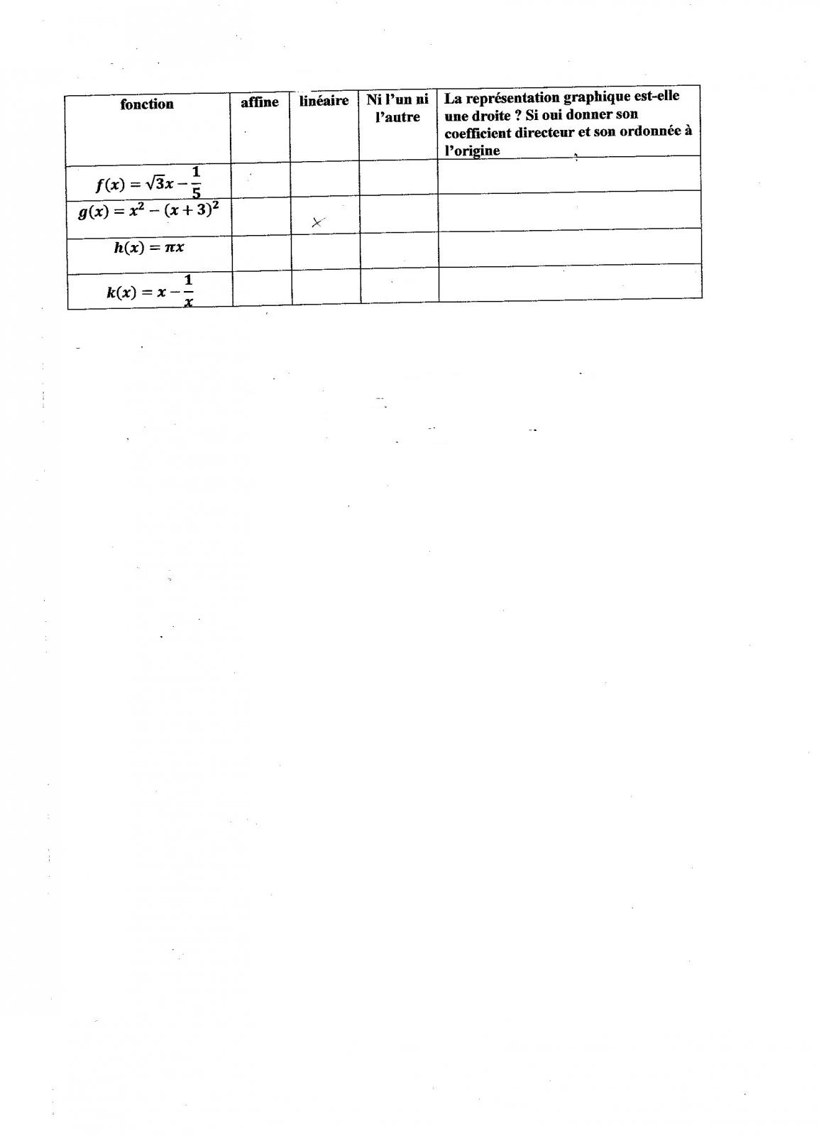 E-Bahut pzorba75 Posté(e) le 12 mai 2015 E-Bahut Signaler Posté(e) le 12 mai 2015 f : x->ax+b est affine si a#0 g: x->ax linéaire si a#0 h :x->1/x inverse, ni affine ni linéaire. À toi d'apprendre ton cours pour répondre en renseignant le tableau.