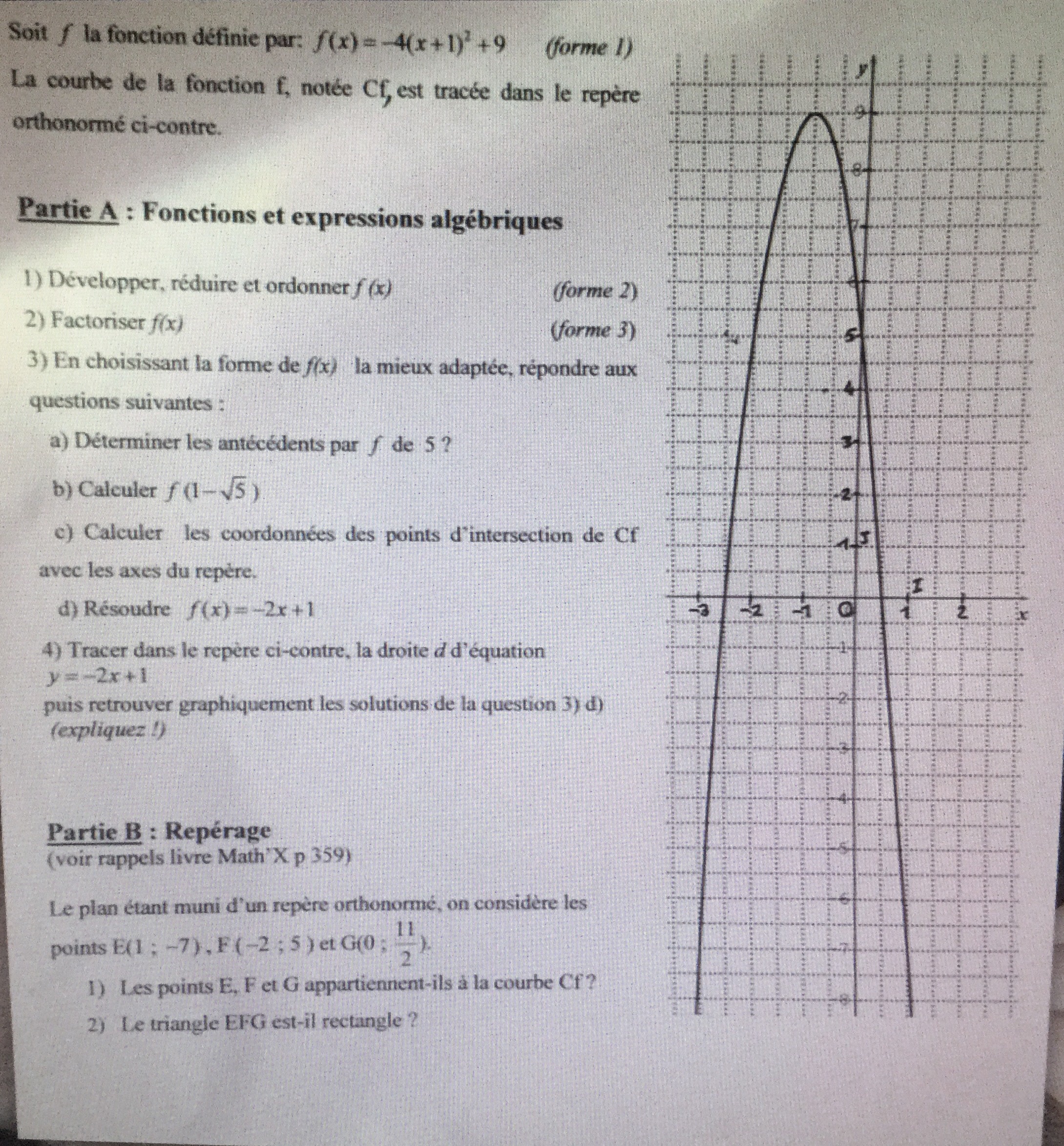 E-Bahut pzorba75 Posté(e) le 5 septembre 2015 E-Bahut Signaler Posté(e) le 5 septembre 2015 1) Développer et réduire : f(x)=-4(x+1)^2+9=--4x^2-8x+5 2) Factoriser : utiliser -b^2+a^2=(a-b)(a+b) avec a=3 et b=2(x+1) Essaie de faire et montre tes réponses, la suite est dépendante de ces réponses.