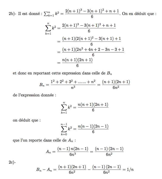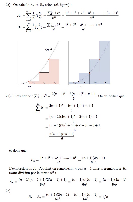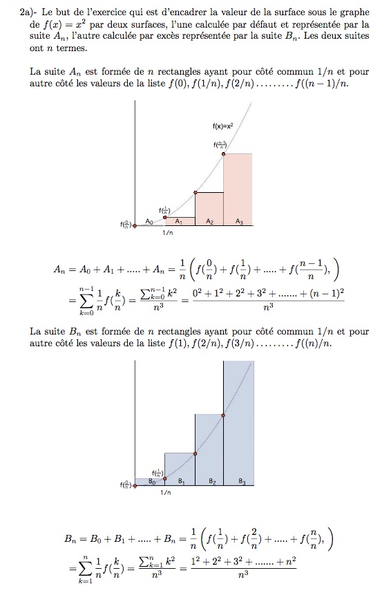 NoctisX55 Posté(e) le 6 septembre 2015 Signaler Posté(e) le 6 septembre 2015 Bonjour!Je voudrais que quelqu'un puisse m'aider avec une partie de mon devoir maison s'il vous plaît. Je remercie d'avance ceux ou celles qui m'aideront!Voici l'énonce:f est la fonction définie sur [0,1] par f(x)=x². On note a l'aire du domaine D situé entre la courbe représentative de f, l'axe des abscisses et les droites d'équations respectives x=0 et x=1. On se propose de déterminer une valeur approchée de a.1. Avec 5 intervallesOn subdivise l'intervalle [0,1] en cinq intervalles de même longueur et on construit les figures suivantes:a)Calculer la somme des aires des rectangles contenus dans D (figure 1).b)Calculer la somme des aires des rectangles qui contiennent D (figure 2).c)En déduire un encadrement de a.2. Avec n subdivisionsOn subdivise l'intervalle [0,1] en n intervalles (n ∈ N , n≥2) de même longueur 1/n. On construit comme ci-dessus n rectangles qui sont contenus dans D et n rectangles qui contiennent D.a)Démontrer que la somme des aires des rectangles contenus dans D est donnée par:An=1²+2²+3²+...+(n-1)² / n^3et que la somme des aires des rectangles qui contiennent D est donnée par:Bn= An=1²+2²+3²+...+n² / n^3b)Un logiciel de calcul formel affiche:1.Cn:=somme(k²,k,1,n) 2.(n+1)^3 -3.(n+1)²+n+1/62.factoriseer(Cn) ((n+1).(2.n+1)).n /6En déduire que:Bn=((n+1)(2n+1))/6n² et An=((n-1)(2n-1))/6n²c)Déterminer le rang n à partir duquel Bn-An≤10^-6d)En déduire un encadremement de a d'amplitude inférieur à 10^-6.Bon alors, pour les question 1.a), 1.b) et 1.c), c'est bon je les ai faites. Le problème vient après...2.a)Les rectangles contenus dans D ont pour largeur 1/n et pour longueur f(1/n). Or f(x)=x², donc An=(1/n)*(1/n)²=1/n^3. Le problème c'est que je n'arrive pas à obtenir le (n-1)².Les rectangles contenus dans D ont pour largeur 1/n et pour longueur f(1/n). Or f(x)=x², donc Bn=(1/n)*(1/n)²=1/n^3. Ici je sais pas comment avoir le n².b) Bn=[2.(n+1)^3 -3.(n+1)²+n+1]/6=[2(n^3+3n²+3n+1)-3(n²+2n+1)+n+1]/6=(2n^3+3n²+n)/6=(2n²+3n+1)/6n²=[(2n+1)(n+1)]/6n²Et pour An je n'arrive pas à trouvé (n-1)(2n-1), soit 2n²-3n+1.c)Bn-An≤10^-6[[(n+1)(2n+1)]-[(n-1)(2n-1)]]/6n²≤10^-6(2n²+3n+1-2n²+3n-1)/6n²≤10^-61/n≤10^-6n≥10^6d)Je ne comprends pas le sens de la question.
