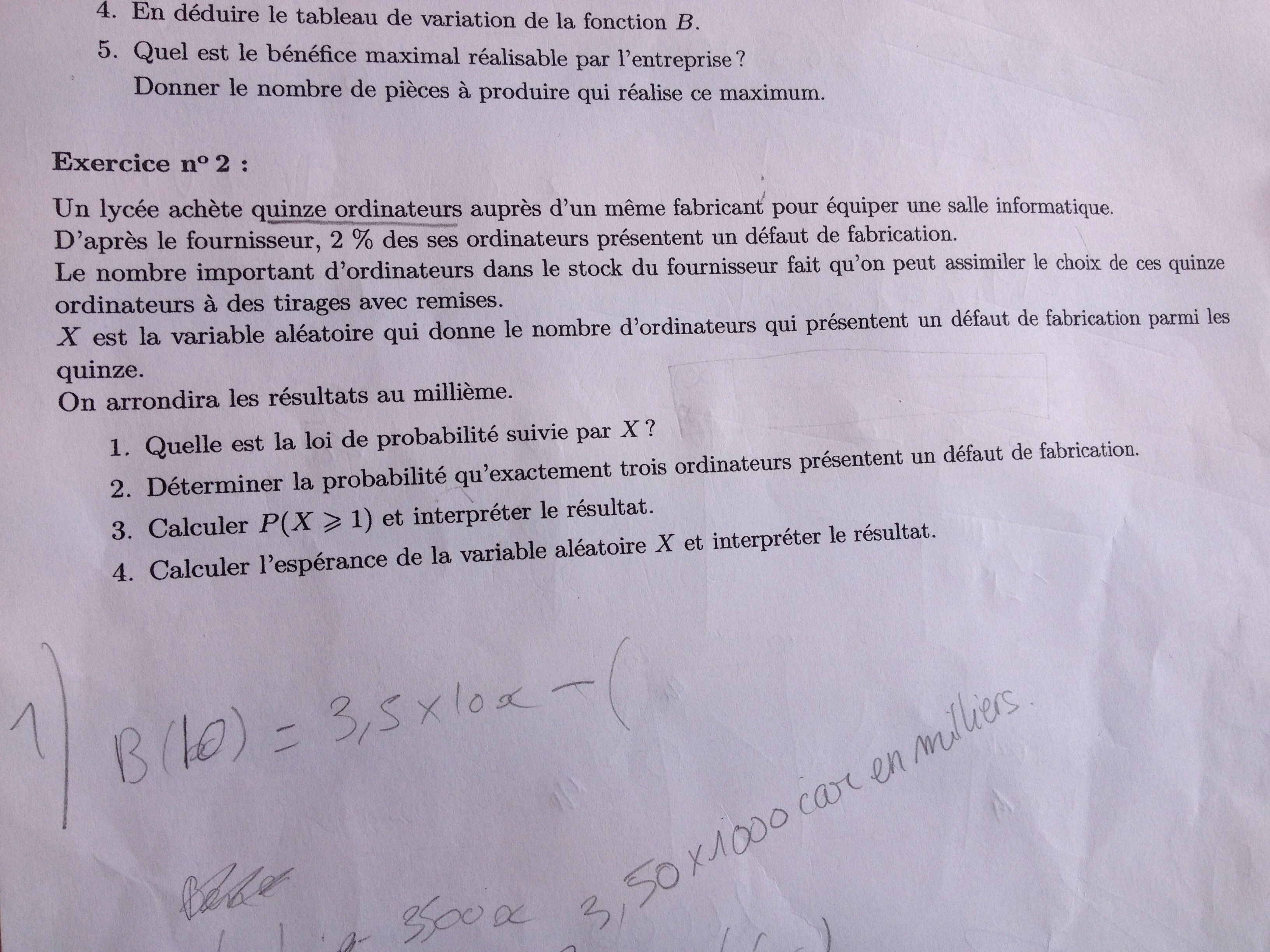 E-Bahut Barbidoux Posté(e) le 8 septembre 2015 E-Bahut Signaler Posté(e) le 8 septembre 2015 un peu d'aide .... 1----------- Loi binomiale B(n,p) de paramètres n=15 et p=0.02 2---------- P(X=3)=(153)p^3(1-p)^12 3--------- P(X≥1)=1-P(X=0)=1-p^15 4--------- E=n*p