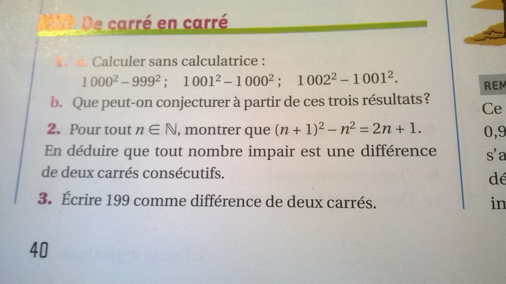 E-Bahut Barbidoux Posté(e) le 13 septembre 2015 E-Bahut Signaler Posté(e) le 13 septembre 2015 1---------- identité remarquable a^2-b^2= … avec a-b=1 1000^2-999^2=1999; 1001^2-1000^2=2001 etc… 2-------- il suffit de développer … 3-------- 199=100^2-99^2