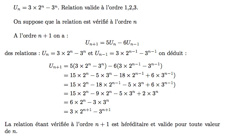 funda45 Posté(e) le 17 septembre 2015 Auteur Signaler Posté(e) le 17 septembre 2015 donc cela ferai U1=3 Un+2=5u1-6u0 U2=5*3-6*2 U2=15-12 U2=3 Et pour U3 on trouve -9 et pour U4 on trouve -63 j'ai une question si on veut démontré par récurrence que pour tout entier naturel n on a : Un=3*2n-3n comment on fait