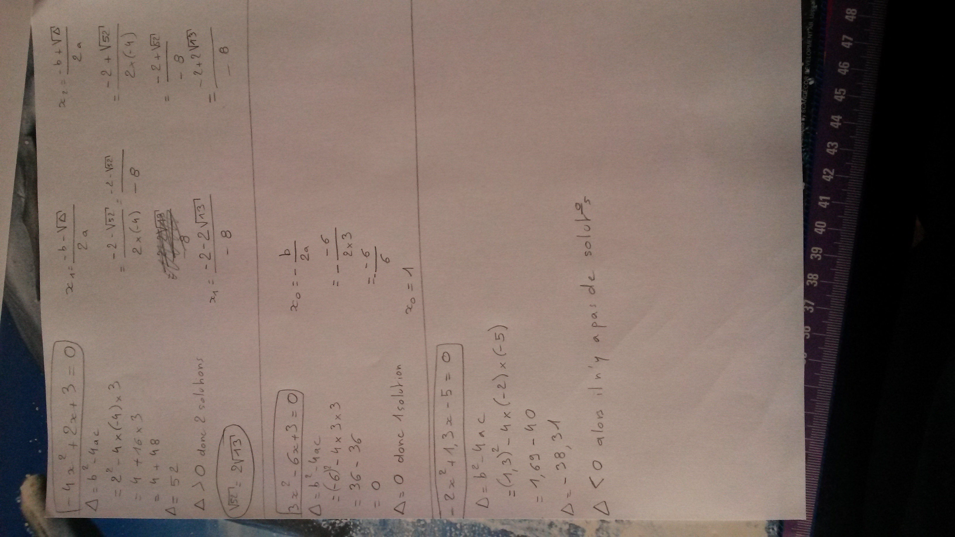 E-Bahut Papy BERNIE Posté(e) le 17 septembre 2015 E-Bahut Signaler Posté(e) le 17 septembre 2015 Bonjour, 1) OK mais tu divises par -2 numé et déno : x1=(1+V13)/4 et x2=(1-V13)/4 2) BON. 3) BON. Bravo!!