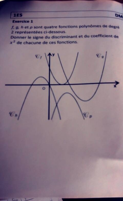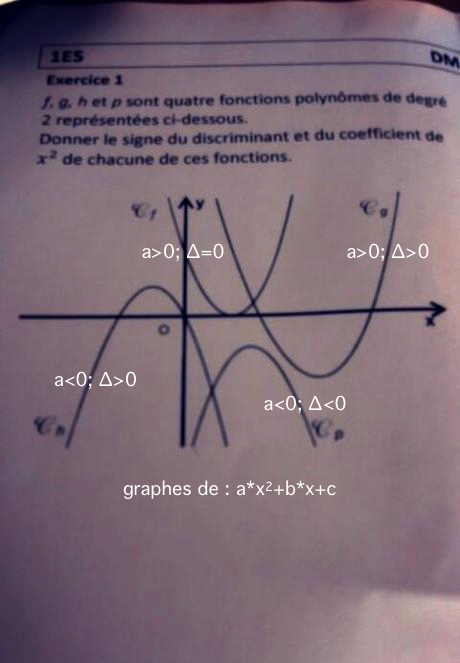 theoreme12 Posté(e) le 22 septembre 2015 Signaler Posté(e) le 22 septembre 2015 Bonjour j'ai besoin d'aide pour cette exercice . J'ai appris mon cour mais je n'arrive pas à résoudre cette exercice Je sais que si le discriminant est strictement positif , l'équation ax²+bx+c=0 a 2 racines cela veut dire graphiquement que la courbe coupe 2 fois l'axe des abcisses.S'il est nul,ax²+bx+c=0 a 1 racine dite double ;cela veut dire graphiquement que la courbe a 1 point de contact avec l'axe des abcisses .s'il est strict neg ,l'equation ax²+bx+c=0 n' a pas de racines réelles ;cela veut dire graphiquement que la courbe ne coupe pas l'axe des abcissses. J'ai appris mon cours mais je n'arrive pas à résoudre cette exercice :/
