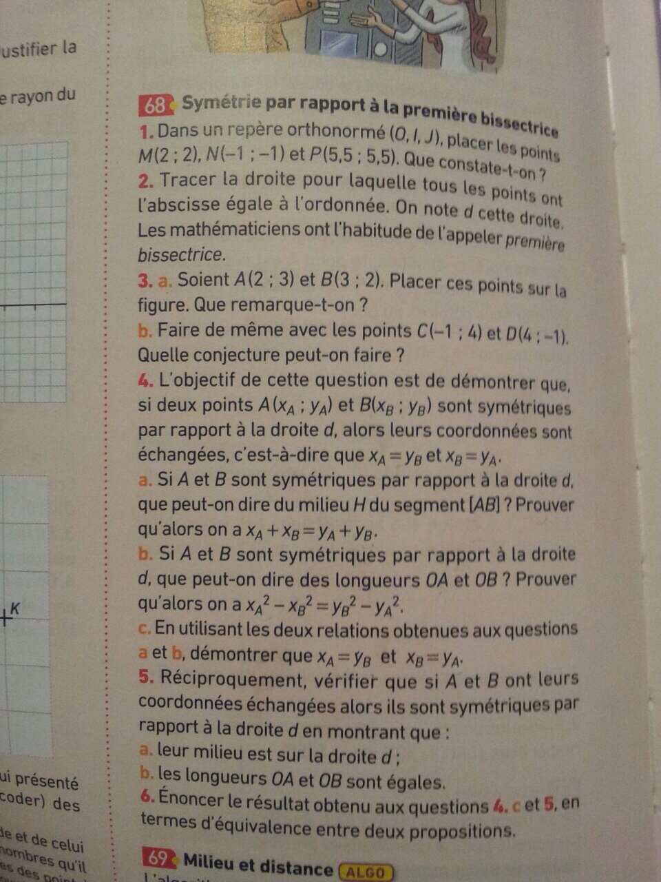 E-Bahut Barbidoux Posté(e) le 23 septembre 2015 E-Bahut Signaler Posté(e) le 23 septembre 2015 1-------------- ils sont alignés 2-------------- les points M, N, P sont sur la droite d 3-------------- Il sont symétrique par rapport à d 4a-------------- H le milieu de AB a pour coordonnée H{(xA+xB)/2,(yA+yB)/2}. Si les points A et B sont symétrique par rapport à d alors H leur milieu appartient à D puisque |AH|=|HD| ==> xH=yH==> (xA+xB)/2=(yA+yB)/2 ==> xA+xB=yA+yB 4b-------------- Si les points A et B sont symétrique par rapport à d alors d est la médiatrice de AB et |OA|=|OB| ==> xA^2+yA^2=xB^2+yB^2 ==>xA^2-xB^2=yB^2-yA^2 ==> (xA+xB)*(xA-xB)=(yA+yB)*(yB-yA) ==> (xA-xB)=(yB-yA) 4c-------------- En résolvant le système d'équation xA+xB=yA+yB xA-xB=yB-yA on obtient xA=yB t xB=yA 4c-------------- je te laisse finir
