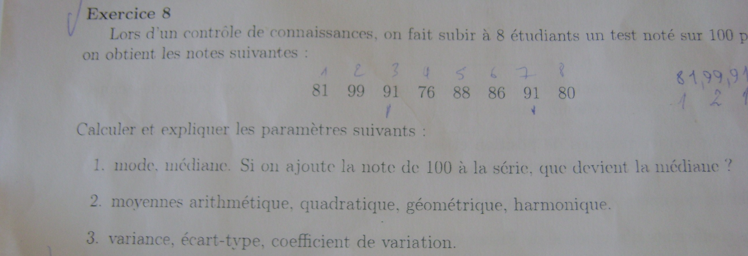 E-Bahut Barbidoux Posté(e) le 26 septembre 2015 E-Bahut Signaler Posté(e) le 26 septembre 2015 1-------------------- On ordonne les notes par valeur croissantes. La note 91 est représentée deux fois c'est donc le mode de la série. La médiane se situe entre 86 et 88 soit 87. Si on ajoute 100 la médiane passe à 88. 2--------- Moyennes : arithmétique moy=(76+80+81+86+88+91+91+99)/8=86.5 géométrique mg=(76*80*81*86*88*91*91*99)^(1/8)=86.23 Quadratique mq=√((76^2+80^2+81^2+86^2+88^2+91^2+91^2+99^2)/8)=86.78 Harmonique mh=8/(1/76+1/80+1/81+1/86+1/88+1/91+1/91+1/99)=85.95 Variance v=((76-86.5)^2+(80-86.5)^2+(81-86.5)^2+(86-86.5)^2+(88-86.5)^2+(91-86.5)^2+(91-86.5)^2+(99-86.5)^2)/8=47.75 ecart-type ec=√v=6.91 coef de variation =ec/moy=6.91/86.5=0.080