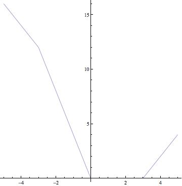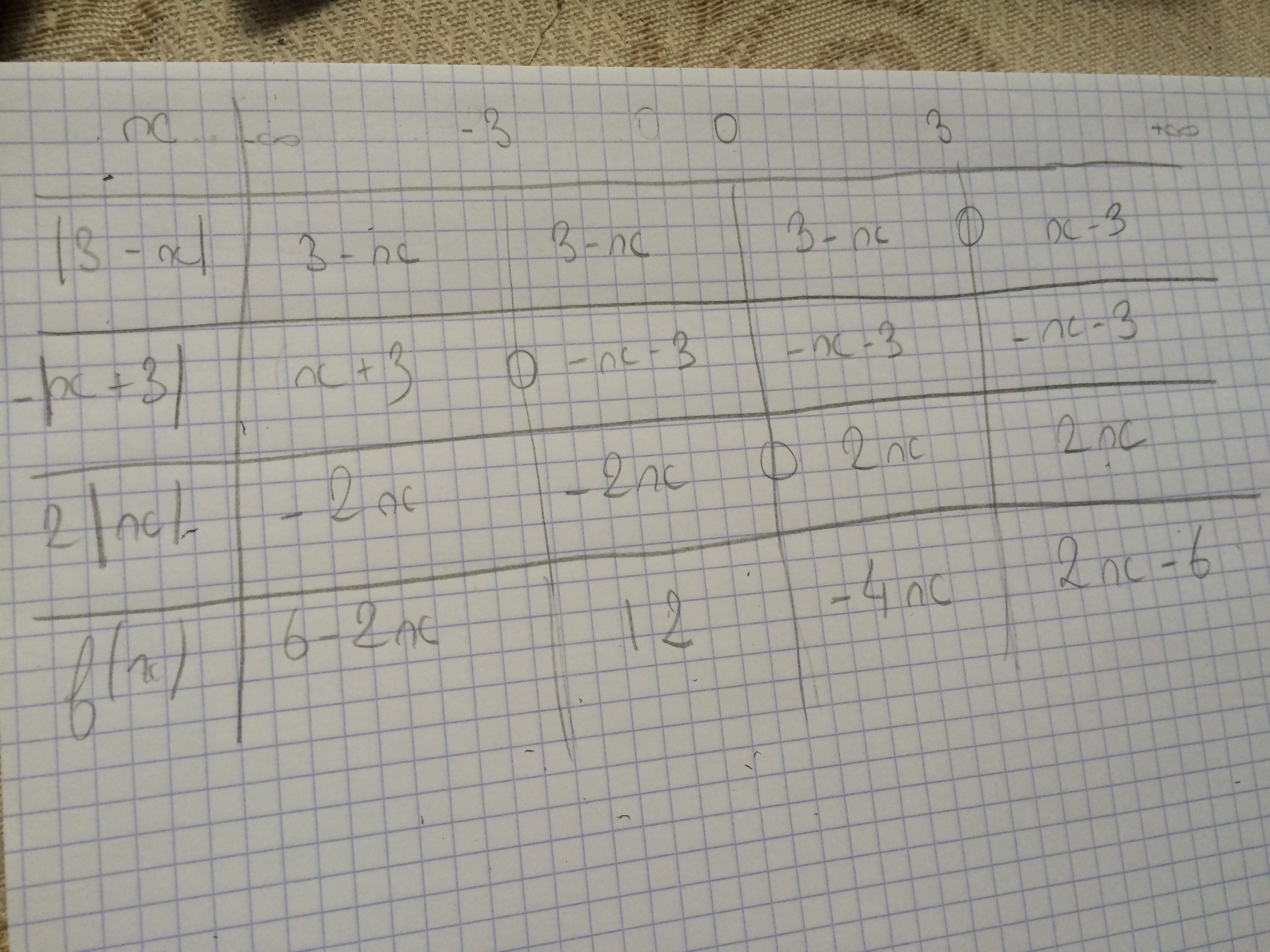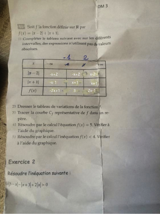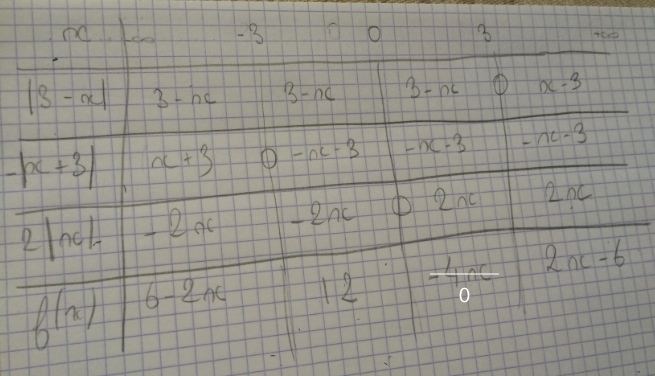 E-Bahut Barbidoux Posté(e) le 4 octobre 2015 E-Bahut Signaler Posté(e) le 4 octobre 2015 x…………….……….(-3)………………(0)…………………..(3)………………… |3-x|……(3-x)………………..(3-x)……………….(3-x)……..(0)……(x-3)…….. -|x+3|……(x+3)……..(0)…….(-x-3)………………(-x-3)………….….(-x-3)…… 2*|x|……..(-2*x)………………(-2*x)…..(0)………(2*x)………………(2*x)…….. ------------------------------------------------------------------------------------------------- f(x)……..(6-2*x)…….(12)……(-4*x)……(0)……..(0)…….…(0)……..(2*x-6)….. inéquation |3-x|-|x+3|+2*|x| >0 (strictement >0) vérifiée pour appartenant à ]-∞ 0[ U ]3, ∞[