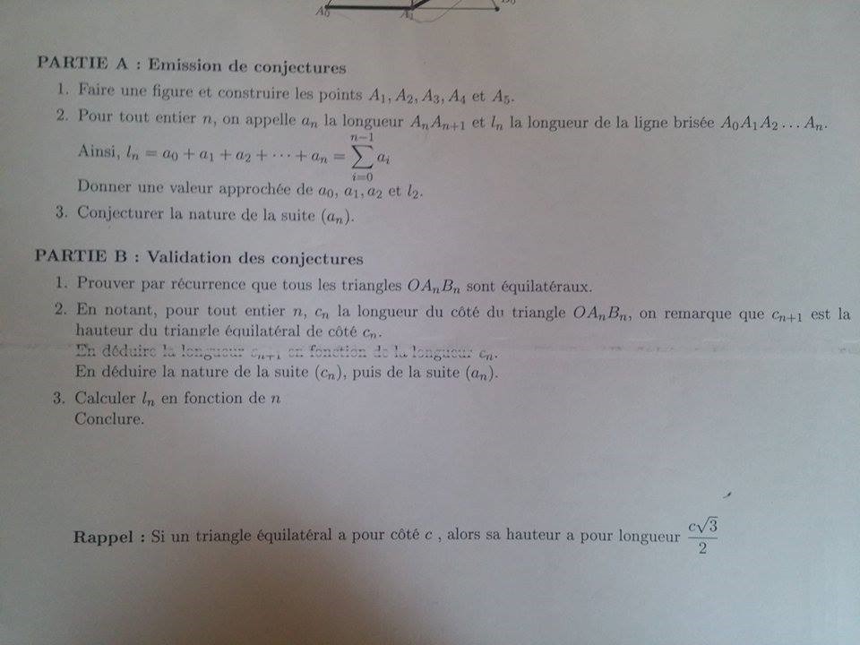 bogerzzz Posté(e) le 19 octobre 2015 Signaler Posté(e) le 19 octobre 2015 Bonjour ! J’espère que le début de vos vacances ce passe bien. Ci-dessous vous pourrez trouver le sujet de mon devoir. Pour la partie 1 rien de très compliqué, j'en viens a conjecturer que la suite an a pour limite +00 (+l'infini). Dans la partie 2 de travaille ce trouve plus difficile, dés la question 1, j'ai essayé plusieurs approchent, par commencer le plus simple soit : AnO=BnO=BnAn soit plus simplement que tout les triangle soit équilatéral. Mais durant l'hérédité je coince, je ne vois pas de sortie je ne voit pas comment résoudre l'équation. J'aimerais savoir si je suis en bonne voit pour trouvé une réponse de mon niveau et si je suis sur la bonne voit vers quoi dois-je m'orienter. Merci de votre réponse amicalement un élève qui fait probablement parti d'une classe de cobaye d'un professeur qui aime bien voir ces élève ce rongé les menins-je