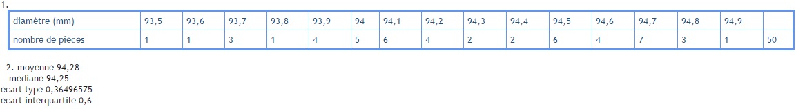 lucile123 Posté(e) le 27 octobre 2015 Signaler Posté(e) le 27 octobre 2015 Bonjour, Pouvez-vous m'aider pour cet exercice svp: Voici la masse, en grammes, de 50 téléphones portables produits par une chaine de fabrication 93,6-93,5-93,8-94-94,2-93,7-94-93,7-94-94,3-94,2-94-94,1-93,9-94,1-93,7-93,9-94-93,9-94,2-94,1-94,1-94,2-94,1-94,3-94,6-94,1-94,7-94,7-94,7-94,7-94,8-94,5-93,9-94,8-94,6-94,8-94,5-94,7-94,4-94,9-94,6-94,5-94,7-94,6-94,5-94,4-94,7-94,5 1.CLASSER les données dans un tableau diamètre (mm) 93,5 93,6 93,7 .....94,9 nombre de pièces 2. Calculer les paramètres statistiques associés à cette série: moyenne, médiane, écart interquartile, écart-type. 3. Représenter le diagramme en boîte associé 4.Représenter le diagramme en bâtons correspondant aux données rangés en tableau. 5. En déduire que l'un des aspects essentiels de la série n'était pas visible jusqu'à présent. Lequel et pourquoi? 6. Regrouper les données en classes d'amplitude 0,3: [93,5;93,8[, [93,8;94,1[.......et représenter l'histogramme de la série ainsi obtenue. Que constate-on? Que penser du choix de ce regroupement en classes? Je n'arrive pas les questions 5) et 6), pouvez-vous m'aider svp (je n'arrive pas à joindre les diagrammes que j'ai réalisé)