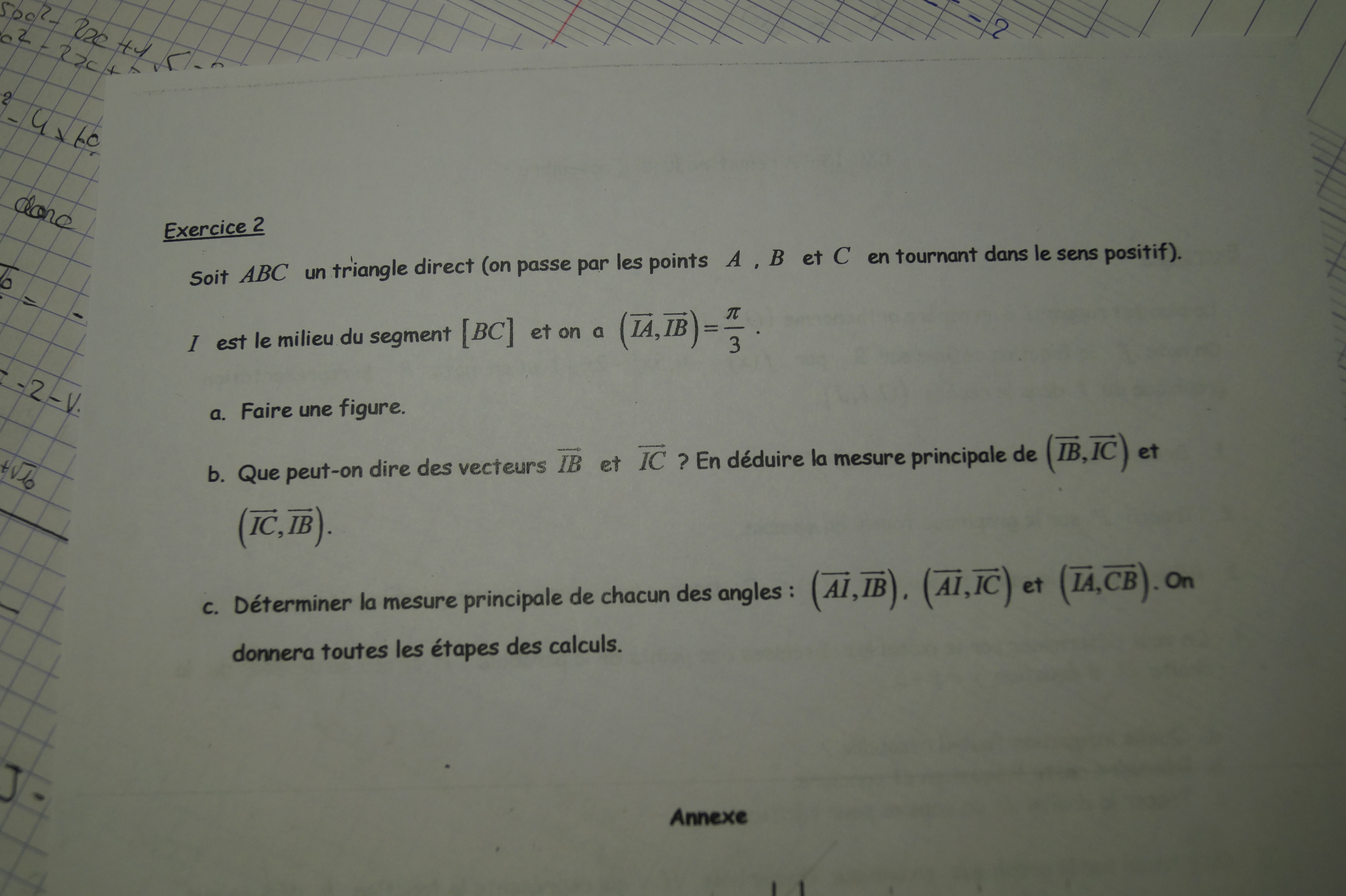 E-Bahut pzorba75 Posté(e) le 27 octobre 2015 E-Bahut Signaler Posté(e) le 27 octobre 2015 1) vec(IB)=-vec(IC) donc angle(IB,IC)=pi (2*pi) 2 angle(AI,IB)+angle(IB,IA)=-pi (2*pi) angle(IB,IA)=-pi/3 (2*pi) =< angle(AI,IB)=-2*pi/3 (2*pi) À toi de rédiger cela correctement et de vérifier si c'est correct. Au travail.
