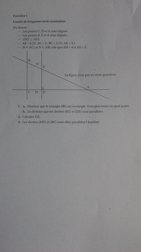 E-Bahut Barbidoux Posté(e) le 28 octobre 2015 E-Bahut Signaler Posté(e) le 28 octobre 2015 1---------------- BC^2+CA^2=3.75^2+5^2=39.0625 AB^2=39.0625 réciproque du théorème de Pythagore ==> ABC est rectangle en C Deux droites perpendiculaires à une même droite sont // entre elles ==> BC//ED 2--------------- Om applique Thalès AD/AC=ED/BC ==> ED=BC*AD/AC=..... 3-------------- On calcule AN/AB=5/6.25=0.8 et AM/AC=4/5=0.8 ==> réciproque de Thalès les droites MN et BC sont // a détailler et rédiger corectement