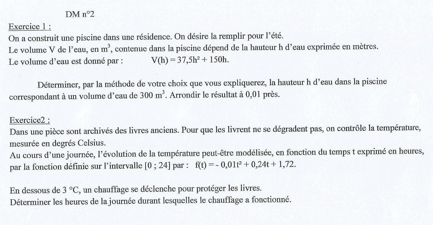 Olivier0507 Posté(e) le 30 octobre 2015 Signaler Posté(e) le 30 octobre 2015 Exercice 1 : Il faut résoudre V(h) = 300 Exercice 2 : Il faut résoudre f(t) < 3