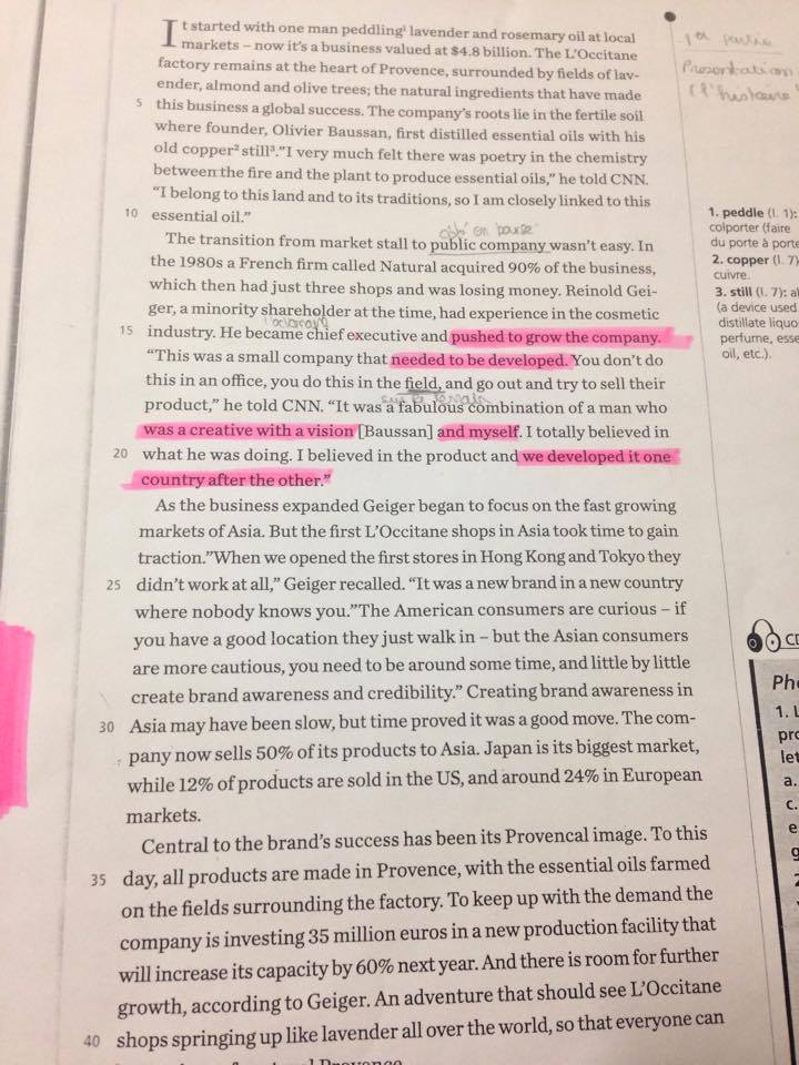 E-Bahut Jean B Posté(e) le 8 novembre 2015 E-Bahut Signaler Posté(e) le 8 novembre 2015 Bonjour, Voilaà mon résumé . Est-ce que c'est juste ? Correction SVP. Ce document est un texte publié par CNN en janvier 2013. Le titre de ce texte est " Comment l'Occitane est devenue grande". Le thème de ce texte est comment l'Occitane est devenue une grande entreprise. L'Occitane est une entreprise française. CSes produits provençalesux ont beaucoup de succès car en effet ils utilisent des matériaux sont fabriqués à partir d'ingrédients naturels pour leurs produits comme la lavande, l'huile d'olive et les amandes pour faires dont sont tirés des huiles essentielles et des cosmétiques. < Où et comment as-tu appris le français ? La société a été fondée par Olivier Baussan. En 1980 l'entreprise à achetée Natural a acheté 90% de l'Occitane qui n'avait alors que 3 magasins. < sinon, c'était un très vilain contresens ! De plus Reinold Geiger, actionnaire minoritaire à l'époque, est devenu le directeur général est à et a augmenté la croissance de la société l'Occitane. L'Occitane développent s'est tournée vers les marchés à croissance rapide en Asie. Mais les premiers magasins ont été lents à démarrer car les asiatiques ne prêteraient pas attentions aux nouvelles boutiques. Alors que les consommateurs américains sont curieux et intéressés par de nouveaux produits. L'Occitane vend à présent 50% de ses produits vers l'Asie, le Japon est le son plus grand marché tandis que le marché américain est pas très grand représente 12% seulement et autour de 25% pour les marchés européens. L'image de la Provence est la clé du succès de l'entreprise. Aujourd'hui tous les produits son fabriqués en France Provence avec les huiles essentielles des plantes cultivées sur place. Pour satisfaire la demande, l'entreprise investit 35 millions d'euros dans une nouvelle unité qui augmentera sa capacité de production de 60% l'année prochaine et selon Geiger ce n'est pas fini.