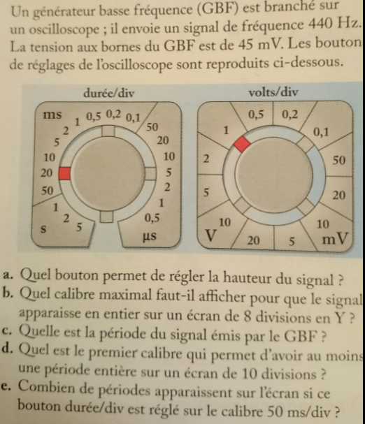 marshmallowb Posté(e) le 11 novembre 2015 Signaler Posté(e) le 11 novembre 2015 Bonsoir, Voici l'énoncé d'un exercice que j'avais à effectuer. J'ai tenté de répondre aux questions mais j'ai des doutes sur les réponses étant donné que je n'ai jamais manipulé d'oscilloscope. Je vous mets ici les calculs effectués sans la rédaction, pourriez-vous m'indiquer si mon raisonnement est correct afin que je puisse rédiger ? a- Il s'agit du bouton volts/div b- 45/8 = 5.62 donc le calibre maximal est de 10 mV. c- Période T = 1000 (ms)/f =1000/440 = 2.27 ms d- Période/10 = 2.27/10 = 0.227 ms soit le calibre 0.5 ms/div e - 50*10=500 ms 500/T = 500/2.27 = 220.26 Merci d'avance à toutes les personnes ayant l'amabilité de me répondre.