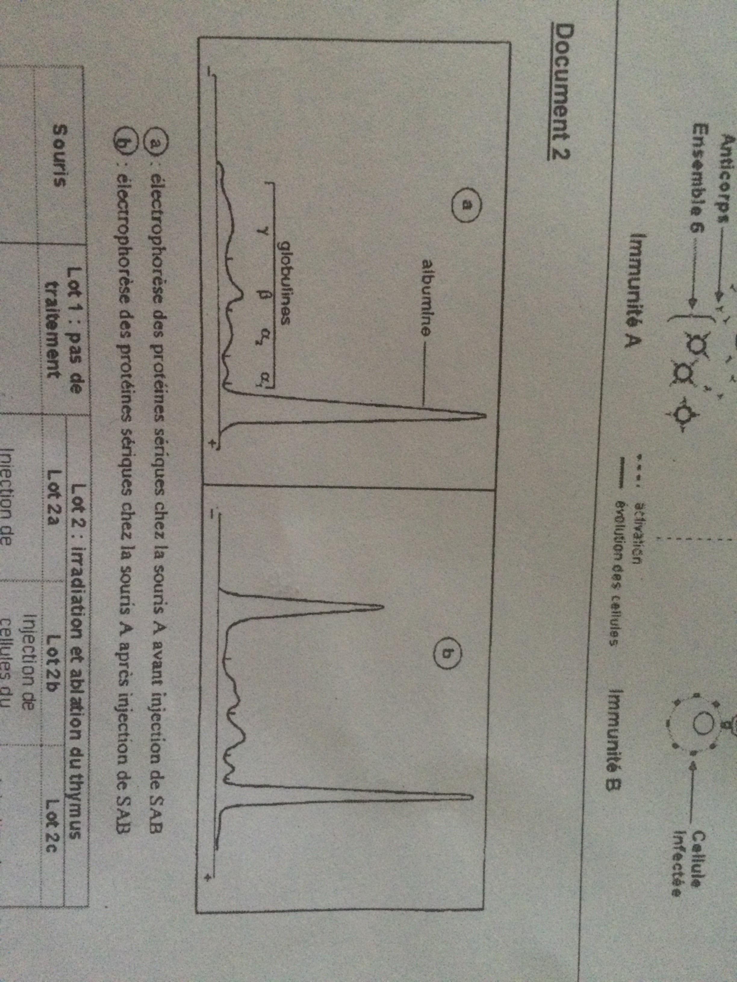 Céliaf Posté(e) le 14 novembre 2015 Signaler Posté(e) le 14 novembre 2015 Bonjour, je bloque sur un exrcice de biologie et j'aurais besoin d'aide. Exercice : une injection de sérumalbumine bovine (SAB) est réalisée chez une souris A. Un prélèvement sanguin est ensuite réalisé. On effectue une électrophorèse des proteines sériques. Les resultats obtenus sont présentés sur le doc 2. Le pic gamma globuline correspond aux anticorps dans le plasma. 1. Comparer les 2 tracés obtenus 2a et 2b et interpreter. 2. D'après cette expérience, que représente la SAB pour la souris A ? 3. Par quel type de réponse, la souris A réagit- elle à l'injection de SAB ? L'image du document est jointe. Mercii