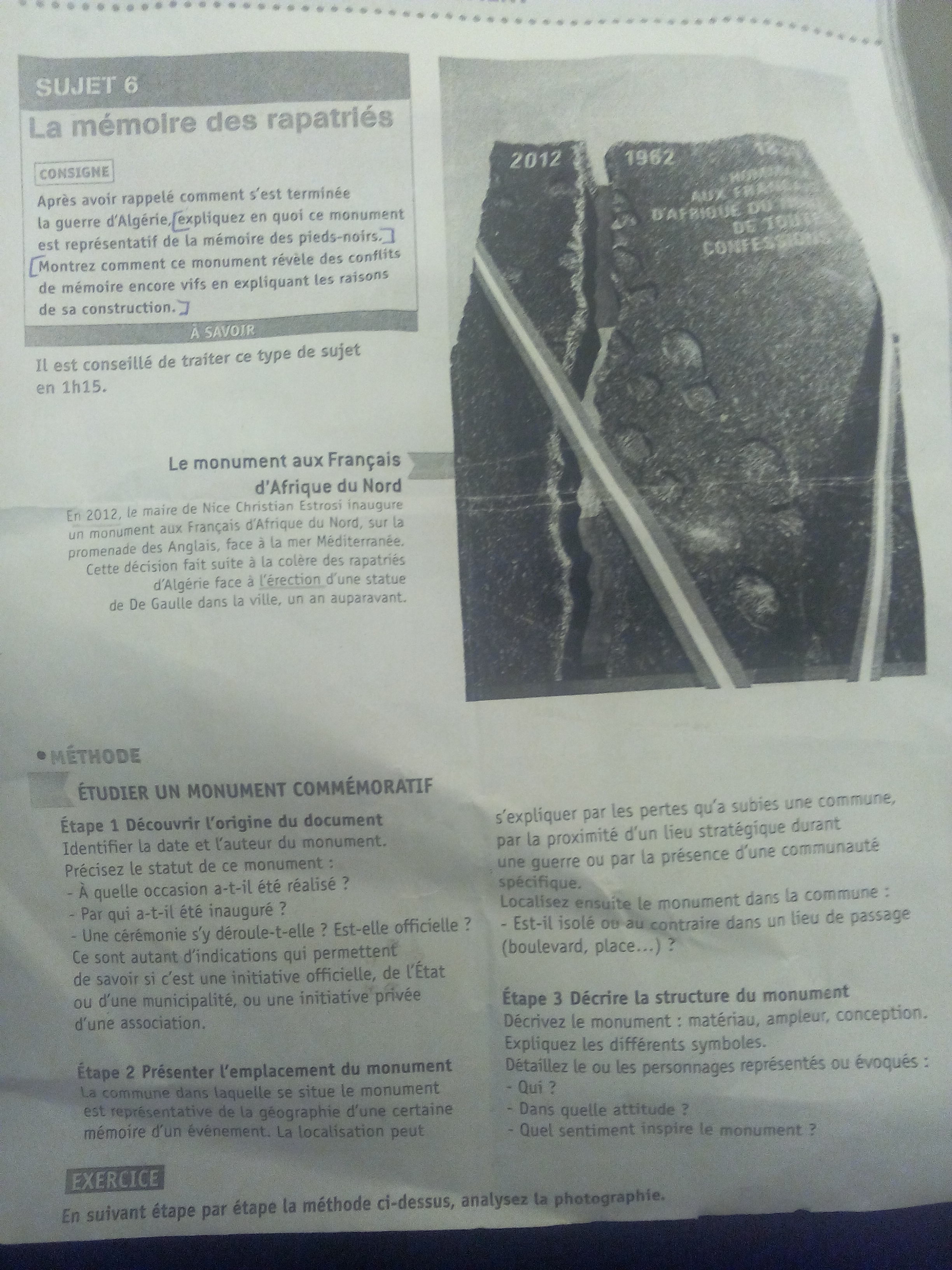 Vina26 Posté(e) le 15 novembre 2015 Signaler Posté(e) le 15 novembre 2015 Bonjour, je vous demande de l'aide pour mon devoir en histoire qui parle des mémoires des rapatriés, le document est une photo pris du monument aux francais d'afrique du nord" fait en 2012 à Nice inauguré par le maire de Nice Christian Estrosi, cette décision fait suite à la colère des rapatriés d'Algérie face à l'érection d'une statue de De Gaulle dans la ville, un an auparavant. Ce monument célèbre 50 ème anniversaire des rapatriés. C'est un analyse de document. J'ai comme consigne : après avoir rappelé comment s'est terminée la guerre d'Algérie, expliquez en quoi ce monument est représentatif de la mémoire des pieds-noirs. Montrez comment ce monument révèle des conflits de mémoire encore vifs en expliquant les raisons de sa construction.