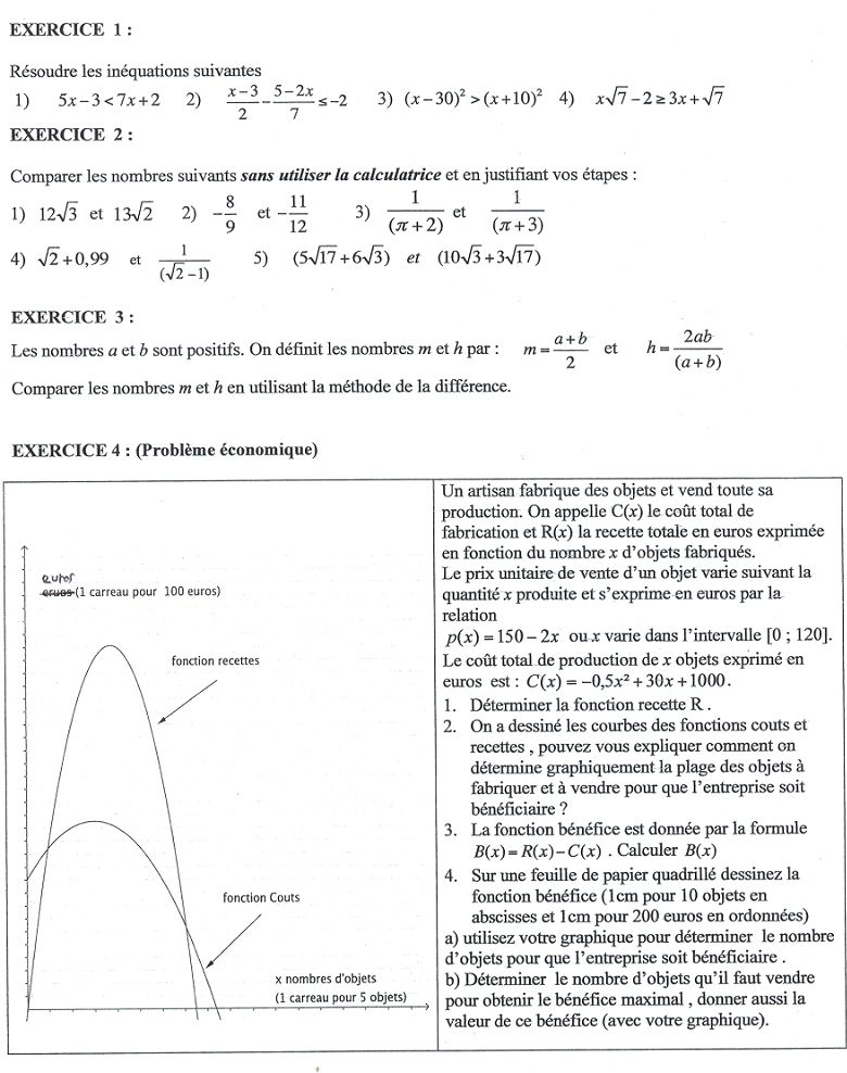 E-Bahut Barbidoux Posté(e) le 18 novembre 2015 E-Bahut Signaler Posté(e) le 18 novembre 2015 ------------------ Exercice 1 ------------------ 5*x-3<7*x+2 ==> -3-2<7*x-5*x ==> -5<2*x ==> -5/2<x --------- (x-3)/2-(5-2*x)/7≤-2 ==> 7*(x-3)/2-2*(5-2*x)/7≤-2*2*7 ==>-3+11*x≤0 ==>x≤3/11 --------- (x-3)^2>(x+10)^2 ==> x^2-60*x+900>x^2-20*x+100 ==> 800>40*x ==> 20>x --------- x*√7-2≥3*x+√7 ==> -2-√7≥ 3*x-x*√7 ==> (-2-√7)/(3-√7)≥x ------------------ Exercice 2 ------------------ (12*√3)^2=432 (13*√2)^2=338 ==> 12*√3>13√2 -------- -8/9=-32/36 -11/12=-33/36 ==> -8/9>-11/12 -------- (π+2)<(π/3) ==> 1/(π+3)<1/(π+2) ------------------ Exercice 3 ------------------ m=(a+b)/2 h=2*ab/(a+b) ==> m-h=(a+b)/2-2*ab/(a+b)=((a+b)^2-4*ab)/(2*(a+b))=(a-b)^2/(2*(a+b) m>h, si a=b alors m=h ------------------ Exercice 3 ------------------ R(x)=x*P(x)=150*x-2*x^2 --------- Détermination graphique il faut que Recette> coût ------------------ B(x)=150*x-2*x^2-(-0.5*x^2+30*x+1000)=-1.5*x^2+120*x-1000 on trace le graphe de B(x) et l'entreprise est bénéficiaire pour un nombre d'objet appartenant à ] 9, 70[