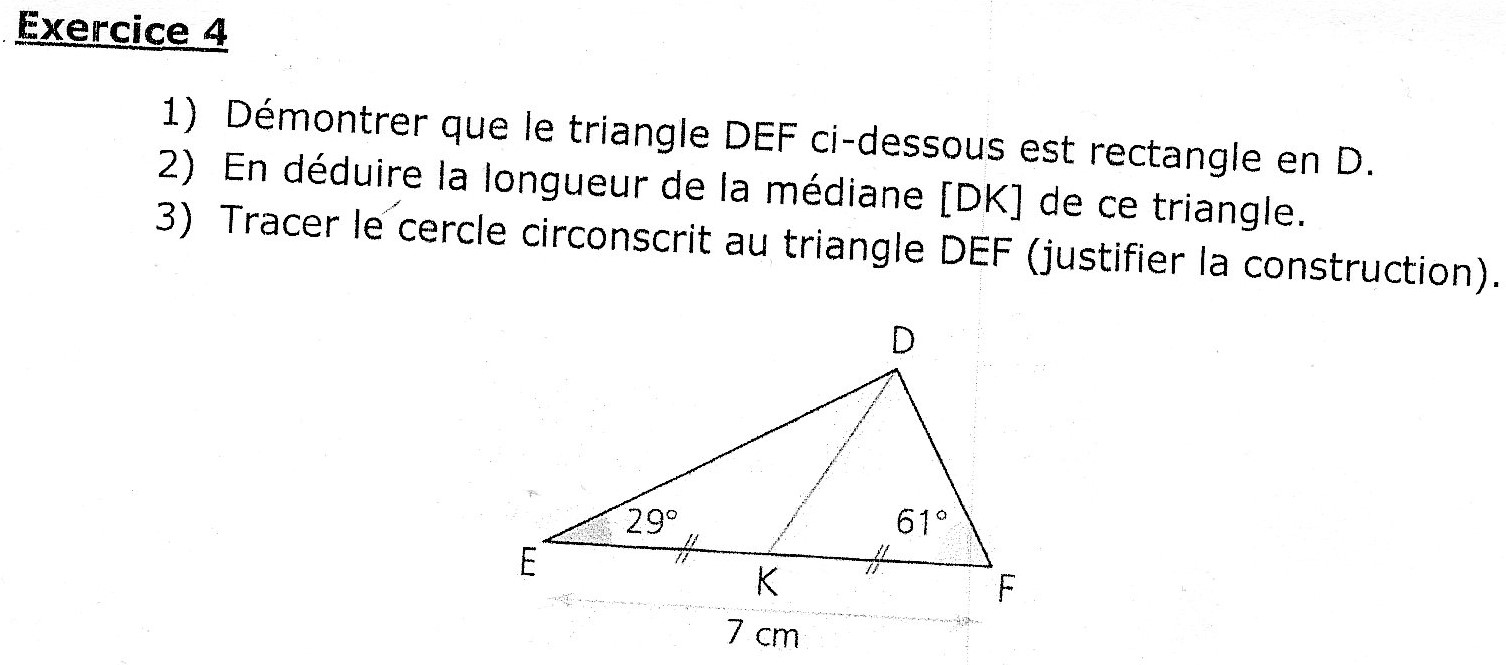 E-Bahut pzorba75 Posté(e) le 20 novembre 2015 E-Bahut Signaler Posté(e) le 20 novembre 2015 F+E=61+29=90 donc D=180-(F+E)=180-90 D est droit et EDF est rectangle en D La médiane est égale à la moitié de l'hypoténuse. le cercle circonscrit est de centre K et passe par E, D et F.