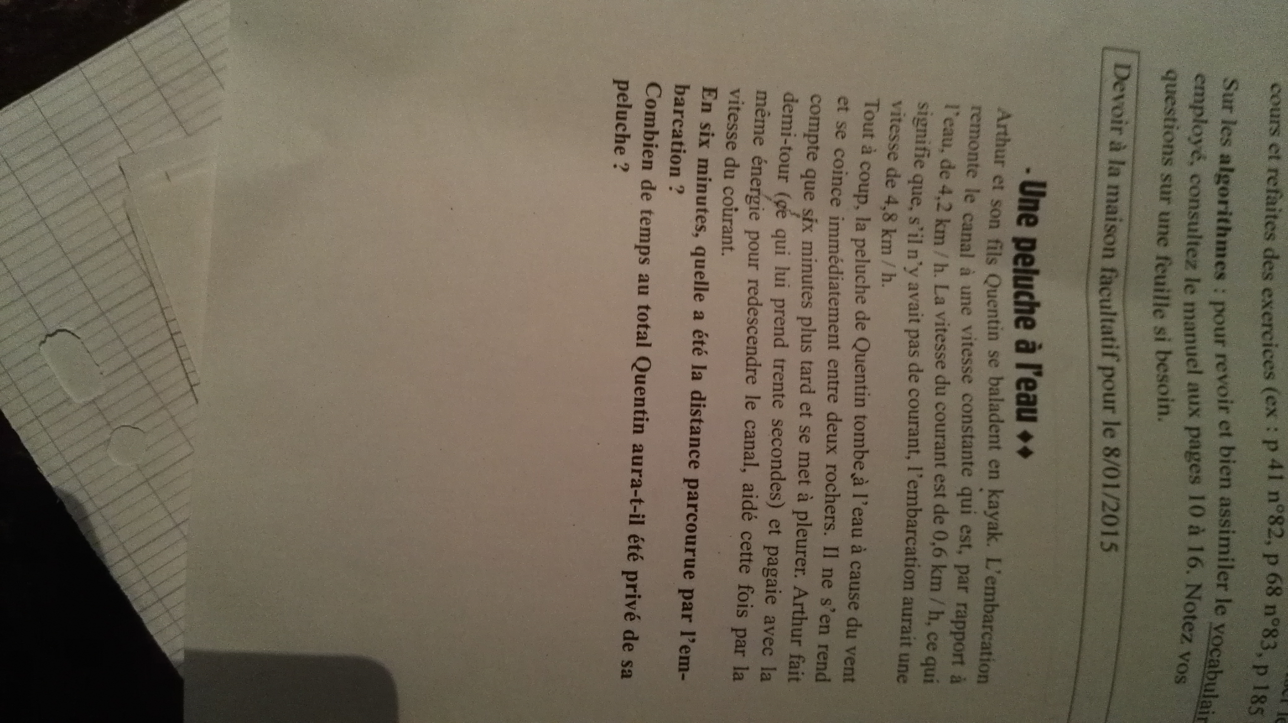 E-Bahut Barbidoux Posté(e) le 3 janvier 2016 E-Bahut Signaler Posté(e) le 3 janvier 2016 vitesse de déplacement du kayak à contre courant 4.2 km/h=(4200/60) m/min=70 m/min. Distance parcourue en 6 minutes= 420 m. Vitesse au retour 4.8+0.6=5.4 km/h=5400/60 m/min=90 m/min temps mis pou parcourir les 420 m =420/90=4.666 min = 4 min 40 s. temps de privation de la peluche 6 min + 30s +4 min 40 s=10 min 70 s=11 min 10 s