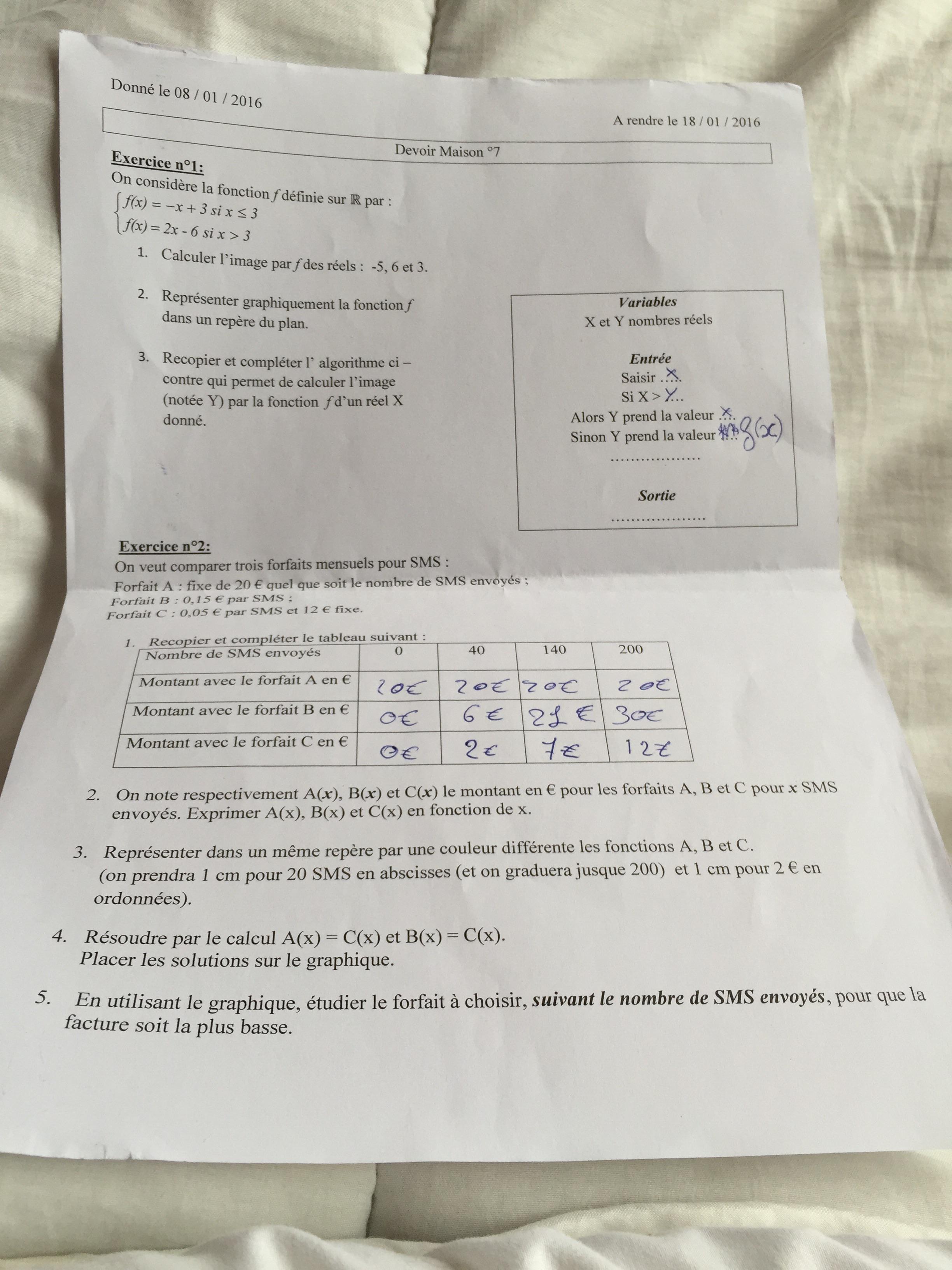 volcano47 Posté(e) le 17 janvier 2016 Signaler Posté(e) le 17 janvier 2016 si x>3, f(x)=2x-6 1)C'est le cas pour x=6 ; donc l'image de 6 par f(x) est f(6) =12 -6 =6 tu utilises l'autre fonction pour l'image de 3 et de -5 qui ne sont pas des nombres >3 2)f(x) est constituée des deux demi droites d'équation y= -x+3 pour x<=3 (droite parallèle à la deuxième bissectrice y= -x mais qui passe par le point ordonnée à l'origine :(0,3 ) (ce point est un point de la droite) y =2x-6 pour les autres valeurs de x ; droite passant par le point (0,-6) et de coeff directeur 2 (tu dois savoir construire une droite y=ax+b connaissant a et b) 3) saisir x si x>3, alors y prend la valeur 2x-6 sinon, y prend la valeur -x+3