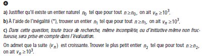 E-Bahut Barbidoux Posté(e) le 20 janvier 2016 E-Bahut Signaler Posté(e) le 20 janvier 2016 1--------------------- exp(0/n)>1 exp(1^2/n)>1+1^2/n exp(2^2/n)>1+2^2/n ………… exp(n^2/n)≥1+n^2/n --------------------- un=exp(0/n)+exp(1^2/n)+………+exp(n^2/n)≥n+1+(1^2/+2^2/n…..n^2)/n=n+1+(n+1)*(2*n+1)/6≥ n+1 puisque un≥n+1 ==> un->∞ lorsque n-> ∞ 2--------------------- Puisque un=exp(0/n)+exp(1^2/n)+………+exp(n^2/n)≥n+1+(1^2/+2^2/n…..n^2)/n et que n>0 on en déduit que un≥(1^2/+2^2/n…..n^2)/n et donc vn=un/n≥ (1^2/+2^2/n…..n^2)/n^2=(n+1)*(2*n+1)/(6*n) >(2*n+1)/6 3--------------- pour n=3 u3=exp(0/3)+exp(1^2/3)+exp(2^/3)+exp(3^2/3)=26.27481 modification de l'algorithme 4.a------------------ On a démontré que vn>(n+1)*(2*n+1)/6 il suffit donc de prendre n tel que (n+1)*(2*n+1)/6>1000. L'équation du second degré (n+1)*(2*n+1)/6-1000 admet deux racines n=-55.52 et 54.02 et est du signe du coefficient de x^2 à l'extérieur de ses racines et il existe donc bien un naturel tel que vn>(n+1)*(2*n+1)/6>10^(3) 4.b------------------ On a démontré que vn≥(2*n+1)/6 si (2*n+1)/6>1000 ==> n≥3000 alors pour tout n≥ 3000 on a bien vn>1000 4c------------------ J'utiliserais pour cette question l'algorithme précédent modifié comme suit