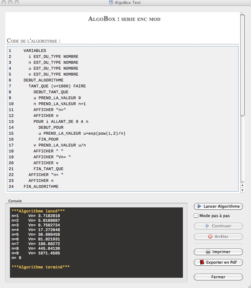 amrand45 Posté(e) le 20 janvier 2016 Auteur Signaler Posté(e) le 20 janvier 2016 pour le 3 ) a) Je mets deja l'algo dans ma calculette en remplaçant n par 3 b) Entrée : Demander à l'utilisateur la valeur de n. Initialisation : Affecter à u la valeur 0 et à v la valeur 0; Traitement : Pour i variant de 0 à n. Affecter à u la valeur u+exp((i2)/n) Fin de la boucle Pour affecter à v la valeur u/n Sortie : Afficher u. afficher v Pour le 4 ) a) limVn=+oo donc il existe un no tel que Vn>10^3 pour n>=n0 b)Vn>=(2n+1)/6 >=10^3 donc n>=(6*10^3 -1)/2 il suffit de prendre n1=E((6*10^3 -1)/2) où E()=partie entière c) Entrée : Demander à l'utilisateur la valeur de e. Initialisation : Affecter à u la valeur 0 et à v la valeur 0 et à n la valeur 0; Traitement : Tant que v < e faire Affecter à n la valeur n+1 pour i allant de 0 à n faire Affecter à u la valeur u+exp(i²/n) fin de la boucle Pour affecter à v la valeur u/n Fin de la boucle tant que; Sortie : Afficher n; Est-ce correcte ? Pardon d'avance si j'en demande trop