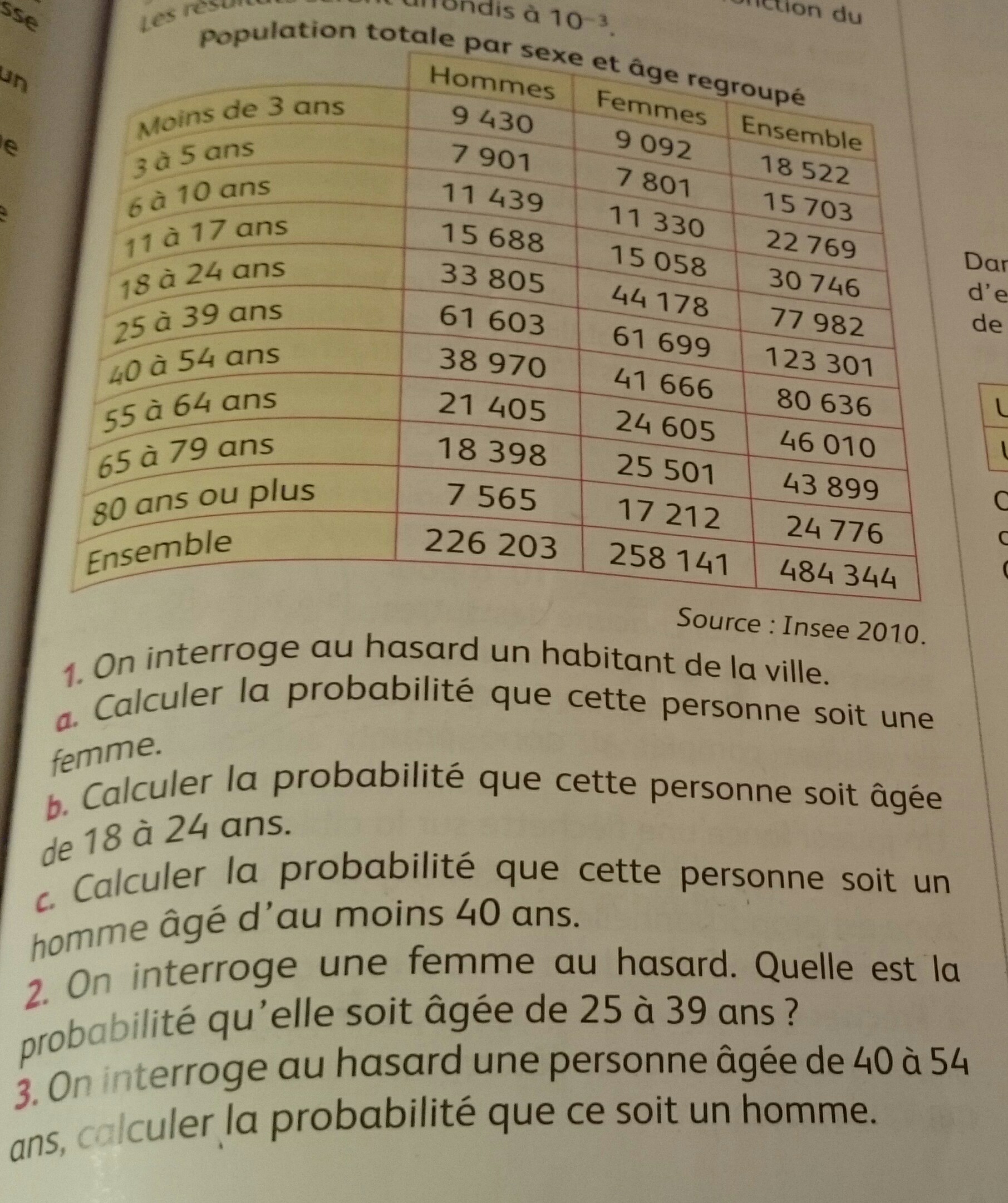 marshmallowb Posté(e) le 20 janvier 2016 Signaler Posté(e) le 20 janvier 2016 Bonsoir, Deux exercices sur le chapitre des probabilités me posent problème car je suis incertaine de la méthode à appliquer (ayant bien revu mon cours auparavant). Je vous met ci-joint la photo de l'énoncé du premier exercice portant sur l'étude d'une population. Concernant ce premier exercice, mes résultats me paraissent faux puisqu'on indique dans les questions qu'il faut effectuer un calcul or je me contente de faire une lecture du tableau. Voici donc les résultats trouvés : 1a: 258141/484344 1b: 77982/484344 1c: 86338/484344 2: 61699/258141 3: 38970/80636 Concernant le deuxième exercice portant sur les échantillons, j'ai su remplir le tableau et voici les résultats trouvés pour la deuxième question : p(A)=37+21=58% p(B)=71% p(C)=8% Pour la question 3) Je dirais qu'il faudrait régler la chaine puisque 100-58=42 Cependant mes résultats me paraissent aussi incorrects ici. Auriez-vous l'amabilité de m'indiquer pourquoi mes résultats sont incorrects et quelles sont les méthodes à appliquer pour parvenir à résoudre les exercices ? Merci d'avance à tous ceux qui auront pris le temps de me répondre.