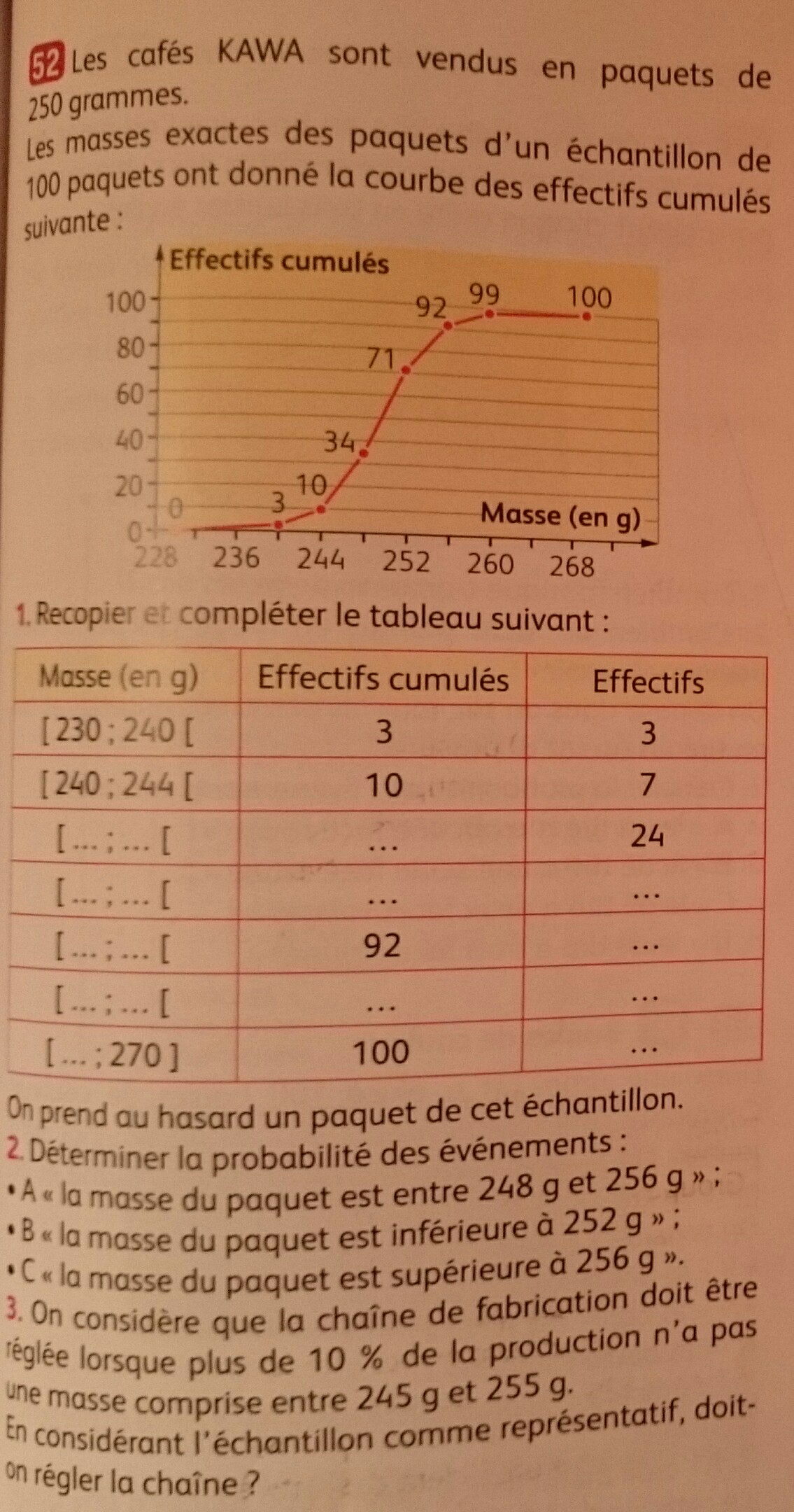 volcano47 Posté(e) le 21 janvier 2016 Signaler Posté(e) le 21 janvier 2016 non, pour l'exercice 1, c'est juste mais il faut effectuer le calcul des fractions (toutes < 1 ce sont des probabilités) et donc ne pas les laisser sous cette forme (0,53 pour le 1a etc...). ex2) Non, pas de problême tout me semble juste : c'est bien la définition : P = effectif considéré /effectif total ; Mais il faut écrire (37+21)/100= 58/100 = 0,58 =58% (ici l'effectif total observé est 100 donc 31+21 donne 58 ..pour cent évidemment ) Pour le réglage de la chaîne, j'ai 21+37+24 =82 paquets situés entre [244 et 256[ donc 18% de non conformes : il faut donc régler la chaîne .