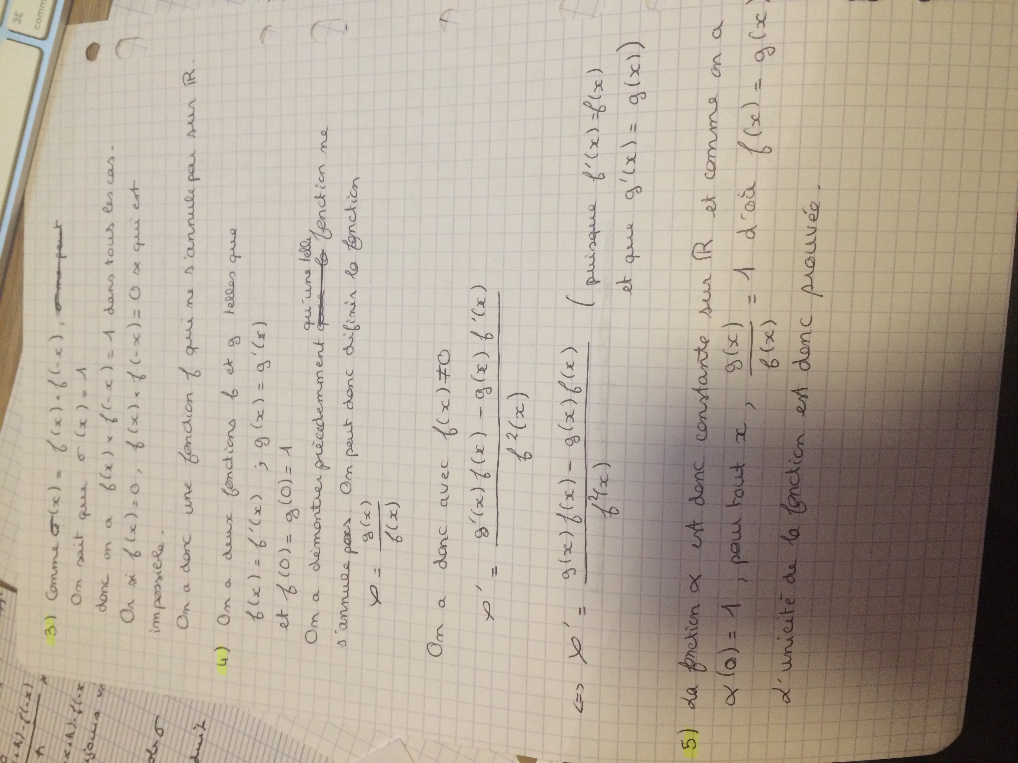 E-Bahut pzorba75 Posté(e) le 8 février 2016 E-Bahut Signaler Posté(e) le 8 février 2016 Pour te mettre au travail, en pensant que ton profil n'a pas été mis à jour, cet exercice étant un ROC exponentielle au programme en TS : 1) t(x)=f(x)*f(-x) t'(x)=f'(x)*f(-x)-f(x)*f'(-x)=0 t'(x)=0 2) t'(x)=0 donc t(x)=k k réel à déterminer avec t(0)=f(0)*f(0)=1 t(x)=1 3 f(x)*f(-x)=1, le produit de deux réels est non nul, aucun de ces réels est nul f(x) <>0 et f(-x)=1/f(x) 4) z(x)=g(x)/f(x) z'(x)=(g'(x)*f(x)-g(x)f'(x))/f(x)^2=0 z'(x)=0 donc z(x)=k z(0)=z(x)=1 donc f(x)=g(x).