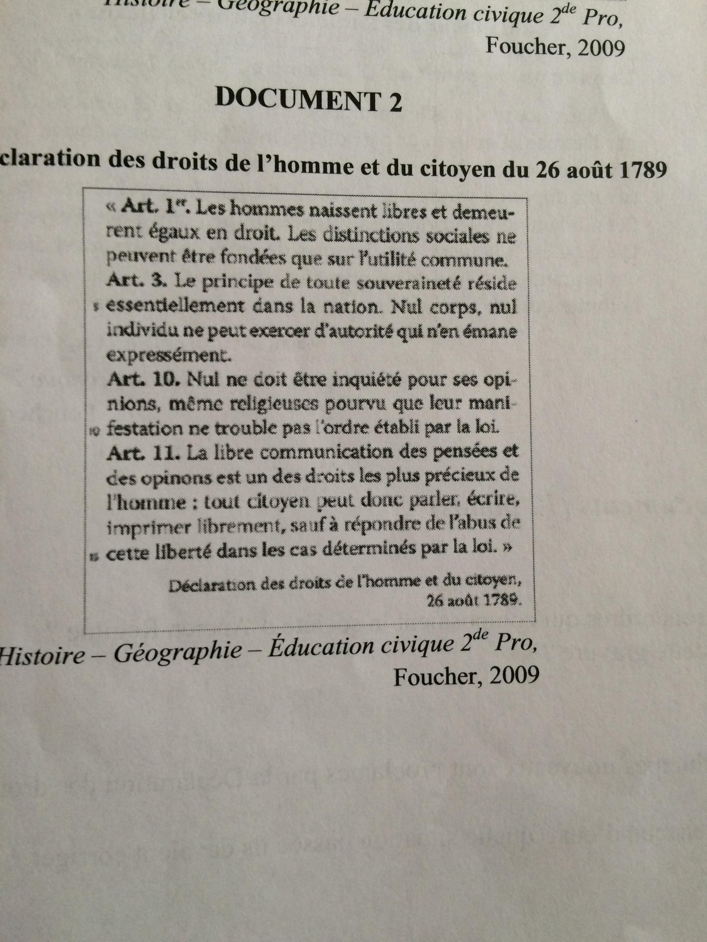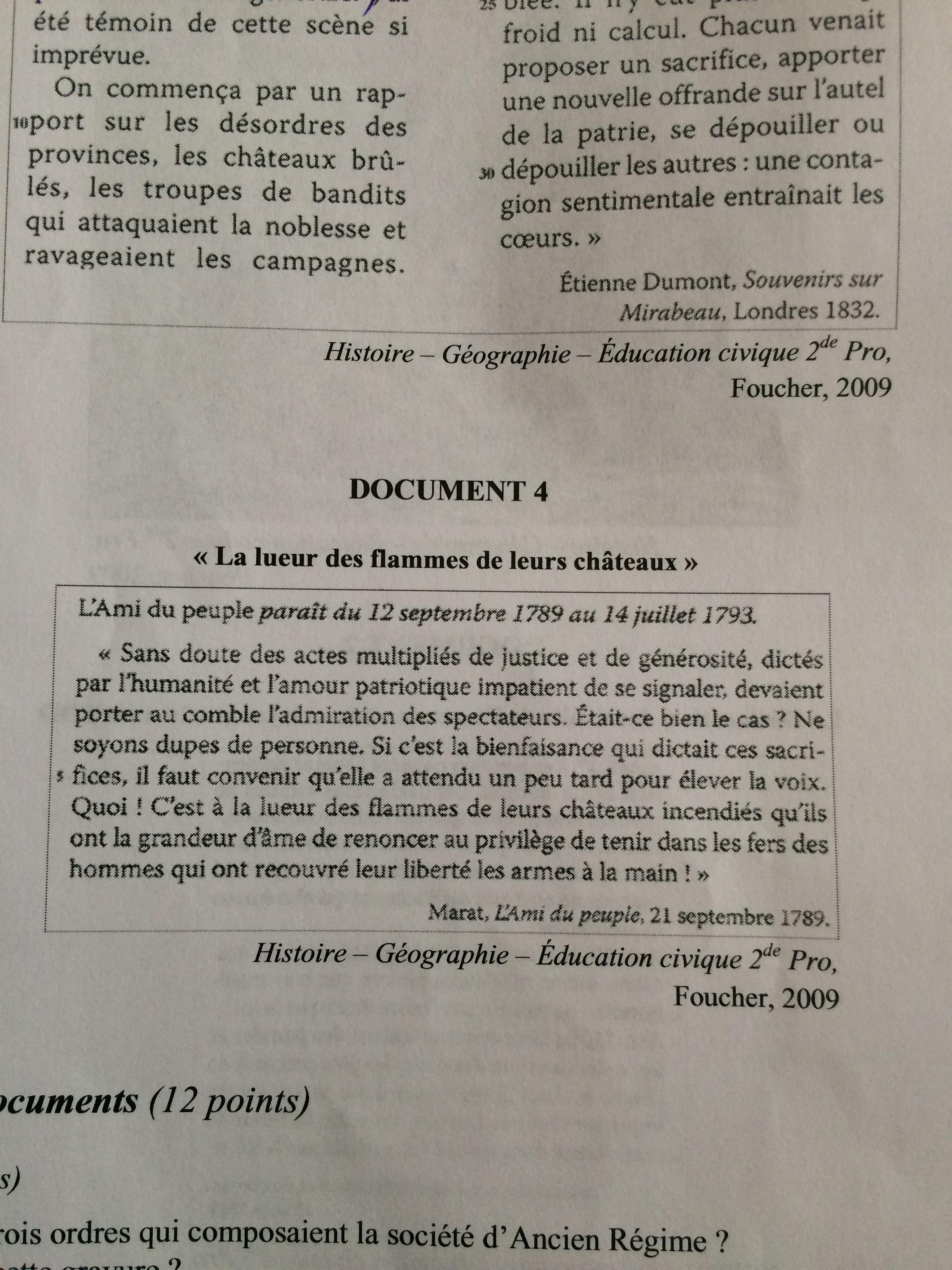 Jenbro Posté(e) le 10 février 2016 Signaler Posté(e) le 10 février 2016 Question Document 1) 1a) Quels sont les trois ordres qui composaient la société d'ancien régime 1b) Que denoncais cette gravure ? Document 2) 2a). Quels grands principes nouveaux sont proclamés par la Déclaration des droits de l'homme et du citoyen du 26 août 1789? 2b). Rappelez, pour chacun d'eux, quelle situation passée ils devaient corriger. document 3) 3a) Qu'est ce qui surprend le plus le jeune secrétaire de Mirabeau ? 3b) Quelle etait alors la situation en France ? 3c) Comment l'assemblée tente t-elle d'y remédier , dans quel état d'esprit ? Document 4 4a) Ques ce que Marat remet en question ? 4b)Quelle est , selon lui la véritable cause du vote unanime pour abolir les priviléges Mobilisez vos connaissance Utilisez vos connaissance pour traiter le sujet suivant La Révolution de 1789 a bouleversé l'ordre établi ; quel changement a telle provoqué et quel en ont été les principaux bénéficiaire ? (ligne 10a 15 ligne )