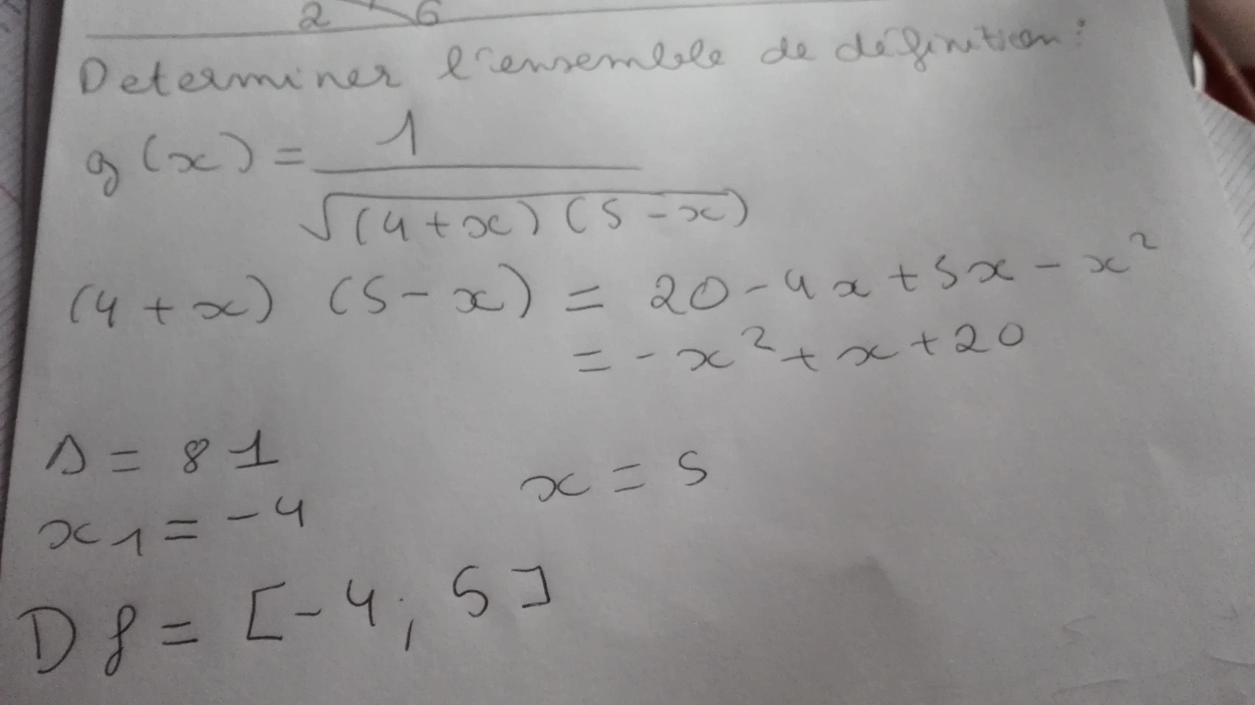 E-Bahut Barbidoux Posté(e) le 20 février 2016 E-Bahut Signaler Posté(e) le 20 février 2016 Inutile de développer et de calculer le déterminant. D'évidence les racines du trinôme du second degré sont -4 et 5 et le trinôme est du signe du coefficient de x^2 à l'extérieur de ses racines. Donc f(x) est défini sur ]-4; 5[. Attention intervalle ouvert (division par 0 impossible)