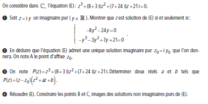 amrand45 Posté(e) le 21 février 2016 Signaler Posté(e) le 21 février 2016 Bonjour, j'ai deux exercice, le premier j'ai essayé de le commencer, sauf que je bloque ensuite, et pour le second je ne comprend pas voici ce que j'ai fait pour le premier : z3 = (iy)3 = i3y3 = i²iy3 = -1iy3 = -iy3 et pour la resolution je sais ce qu'il faut que je fasse, mais je n'y arrive pas.. -8y² - 24y = 0 -8y(y+3) = 0 -8y = 0 ou y+3 = 0 y=0 ou y=-3. et je dois comparer avec {-y^3 - 3y² + 7y + 21 = 0. mais je bloque....