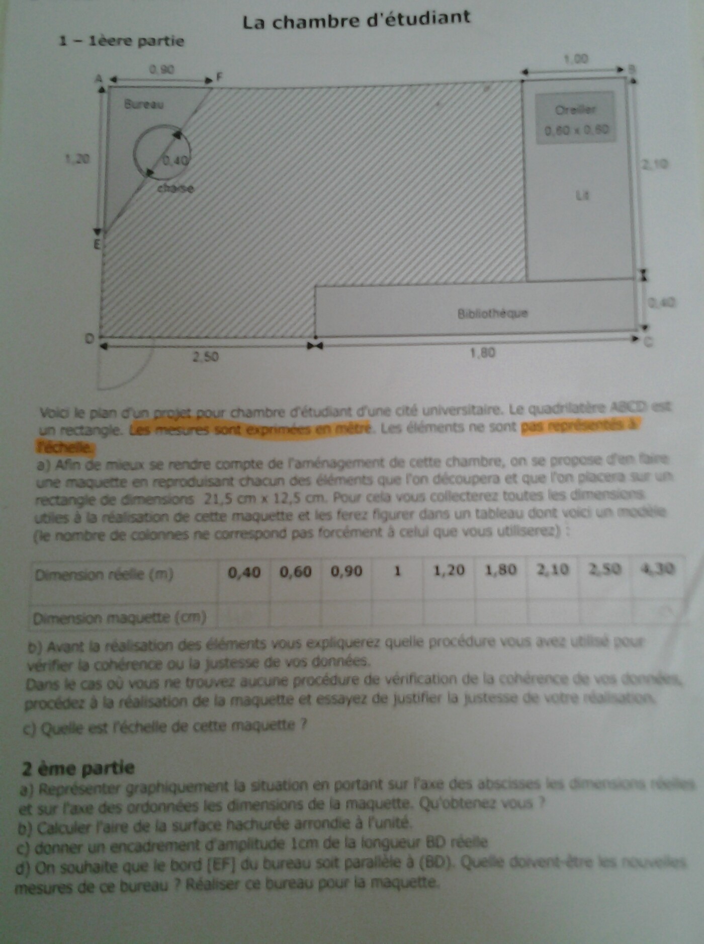 volcano47 Posté(e) le 22 février 2016 Signaler Posté(e) le 22 février 2016 le plan représentant une pièce de longueur L= 2,5+1,8=4,3 m et de largeur 2,5 m est un rectangle de longueur L' =21,5 cm et de largeur 12,5 cm (pour prendre une photo nette il faut un peu plus de lumière et tenir l'appareil à deux mains pour ne pas bouger !). L'échelle est donc le rapport : maquette /réalité = 21,5/430 =0,05 (=12,5/250 ce qui vérifie la cohérence, voir b)) tout doit donc être à la même échelle . Par exemple, 0,4 m est représenté par 0,05x0,4 =0,02 m =2cm et ainsi de suite pour remplir le tableau en cm b) c'est ce que j'ai fait au début , à savoir vérification que le rapport maquette/réalité est constant pour la longueur et la largeur de la pièce c) voir plus haut : le 5/100 donc ou 1/20 partie 2 : on doit obtenir une droite (passant par l'origine) qui traduit la proportionnalité de la maquette par rapport à la réalité. Le coefficient directeur est l'échelle. Pour l'aire hachurée, il suffit d'enlever les morceaux non hachurés à l'aire totale du rectangle (Lxl). La longueur BD (si je lis bien) est la diagonale du rectangle donc BD² =L² +l² Tout ceci se calcule en m, je suppose. Si EF est // BD , c'est que l'angle de EF avec AB par exemple est le m^me que celui de BD avec AB ; donc exprime l'égalité de la tangente AF/AE = AB/AD ; je ne sais pas si on change AF ou AE, mais je pense que dans ce cas, on garde un des deux et on change l'autre. Là ça manque un peu de précision.