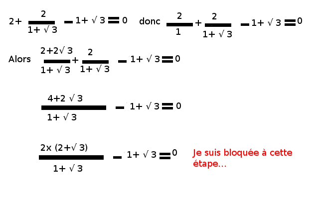 E-Bahut pzorba75 Posté(e) le 23 février 2016 E-Bahut Signaler Posté(e) le 23 février 2016 1+1/(1+1/(1+sqrt(3)))=1+1/((2+sqrt(3))/(1+sqrt(3)))=1+(1+sqrt(3))/(2+sqrt(3))=(3+2*sqrt(3))/(2+sqrt(3))=sqrt(3) CQFD C'est plus lisible en passant par Latex, mais ce forum ne le permet pas.