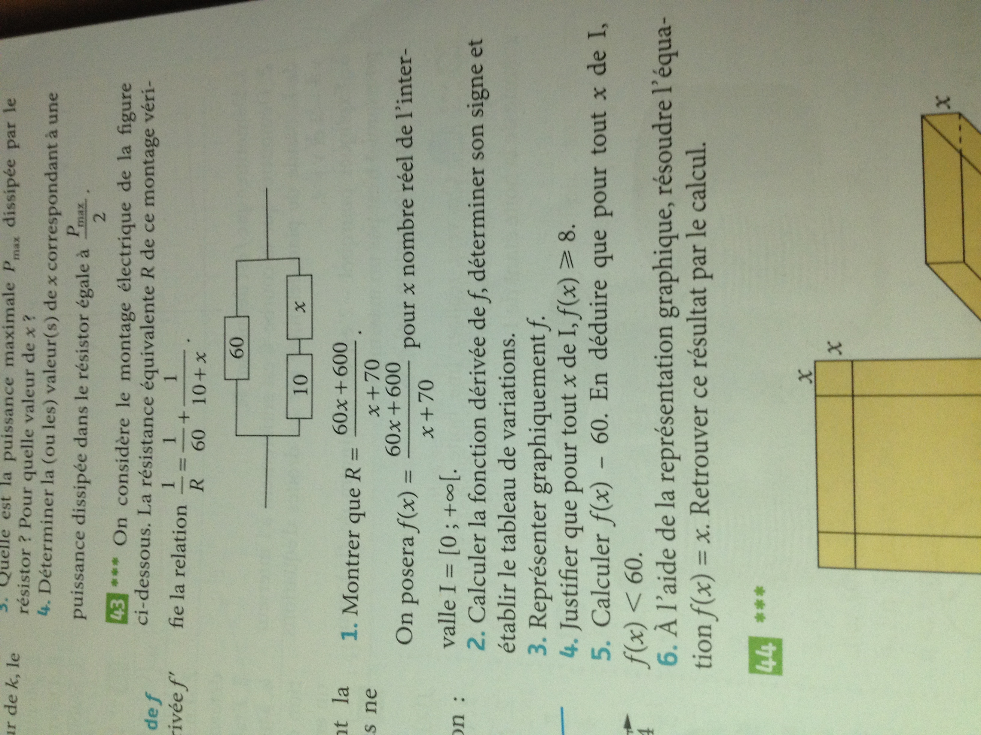 aaazzhin Posté(e) le 6 mars 2016 Auteur Signaler Posté(e) le 6 mars 2016 il y a une heure, Denis CAMUS a dit : Réduction au même dénominateur : Tu as une somme de fractions, l'une sur 60 et l'autre sur 10 + x. Tu mets les fractions sur le dénominateur 60(10 + x). Évidemment, il faut corriger le numérateur. Et ensuite pour passer de 1 / R à R, tu intervertis à droite numérateur et dénominateur. Souvenirs de collège. merci bien j'ai compris et réussis le tableau de variation montre que f est croissante mais je vois pas comment la representer graphiquement. avec quels points ?