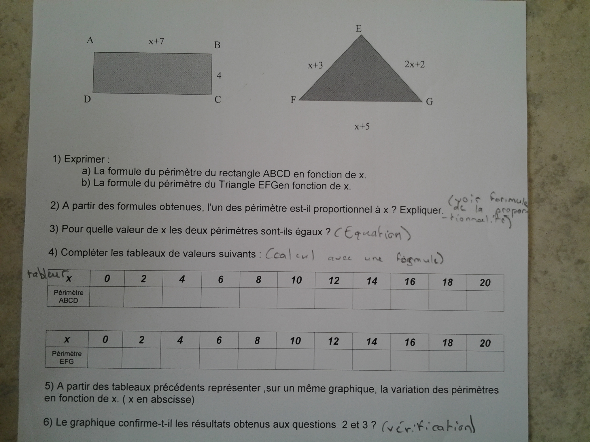 E-Bahut Barbidoux Posté(e) le 13 mars 2016 E-Bahut Signaler Posté(e) le 13 mars 2016 1a------------ P1=2*(4+x+7)=2*x+22 1b------------ P2=(x+3+2*x+2+x+5)=4*x+10 2------------- il ne sont pas proportionnels à x car il ne sont pas de la forme k*x où k est un nombre réel 3------------- 2*x+22=4*x+10 ==> x=6