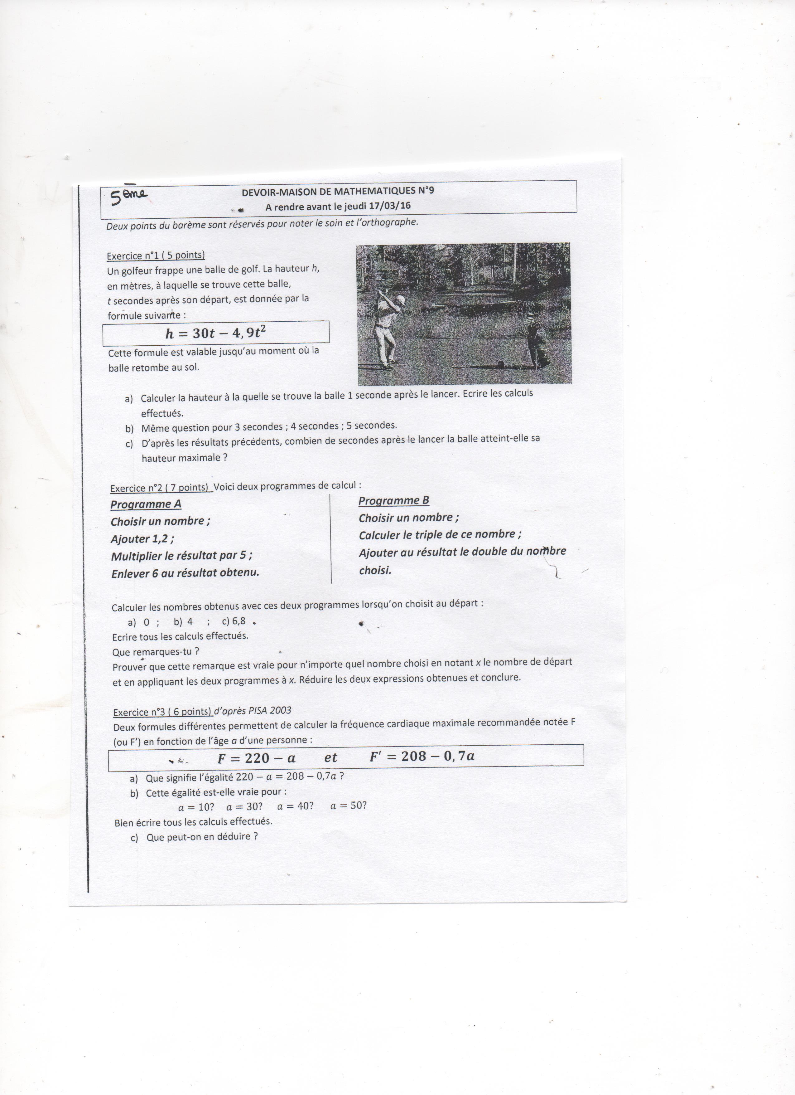 E-Bahut Denis CAMUS Posté(e) le 15 mars 2016 E-Bahut Signaler Posté(e) le 15 mars 2016 Tu es en France ? il y a 22 minutes, fred30 a dit : bonjour j'aurais besoin d'aide pour terminer mon dm merci de bien vouloir me dire si ce que j'ai fait est correct merci exercice 1 a) aprés une seconde H= 25,1 OK. b) pour 3 secondes=45,9 OK. pour 4 secondes=41,6 OK. pour 5 secondes=27,5 OK. c) au bout de 6 secondes Non. On ne demande pas le sol, mais la hauteur max. exercice 2 programme A programme B avec 2 avec 2 2+1,2=3,2 OK. 2*3=6 OK. 3,2*5=16 OK. 6+2*2=10 OK. 16-6=10 OK. a) avec 0 A=0 et B=0 OK. b) avec 4 A=20 B=20 OK. c) avec 6,8 A=34 B= 34 OK. on remarque que peut importe le nombre choisi on obtient toujours A=B aprés je sais pas. Tu fais la même chose que lorsque tu as choisi 2, mais à la place de 2 tu écris x. exercice 3 a) cela veut dire que peut importe la valeur de a on aura toujours F=F' OK. Cela veut aussi dire que les deux expressions sont équivalentes. On peut employer l'une ou l'autre. b) pour a=10 c'est faux OK. pour a=30 c'est faux OK. pour a=40 c'est vrai OK. pour a=50 c'est faux OK. c) on peux en déduire que F n'est pas égal à F' OK. On te demande quand même de bien montrer tes calculs. et donc les résultats. je vous remercie par avance pour votre aide