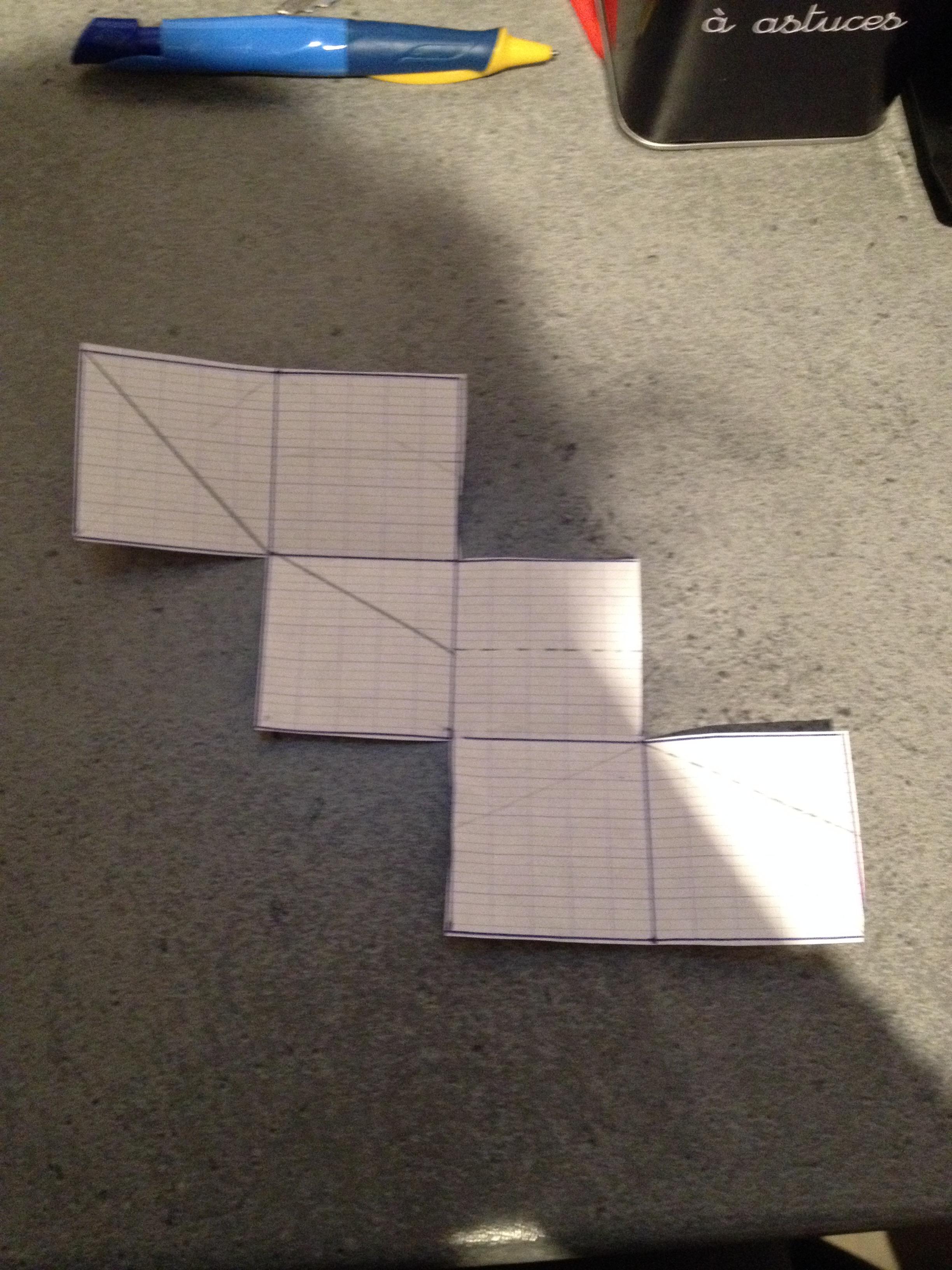spiderman Posté(e) le 21 mars 2016 Signaler Posté(e) le 21 mars 2016 Bonjour j ai un exercice à faire : dans ce patron ( photo grise) il y a un chemin de quatre segments qui a été tracer en trait pleins sur les faces qui se voient et en pointillés sur les faces cachées . je dois reproduire ce patron ( cf pj) et dessiner en vert ce chemin sur le patron . Je n arrive pas à trouver les chemin j ai fais le patron mais le Chemin Vert je n y arrive pas .:(