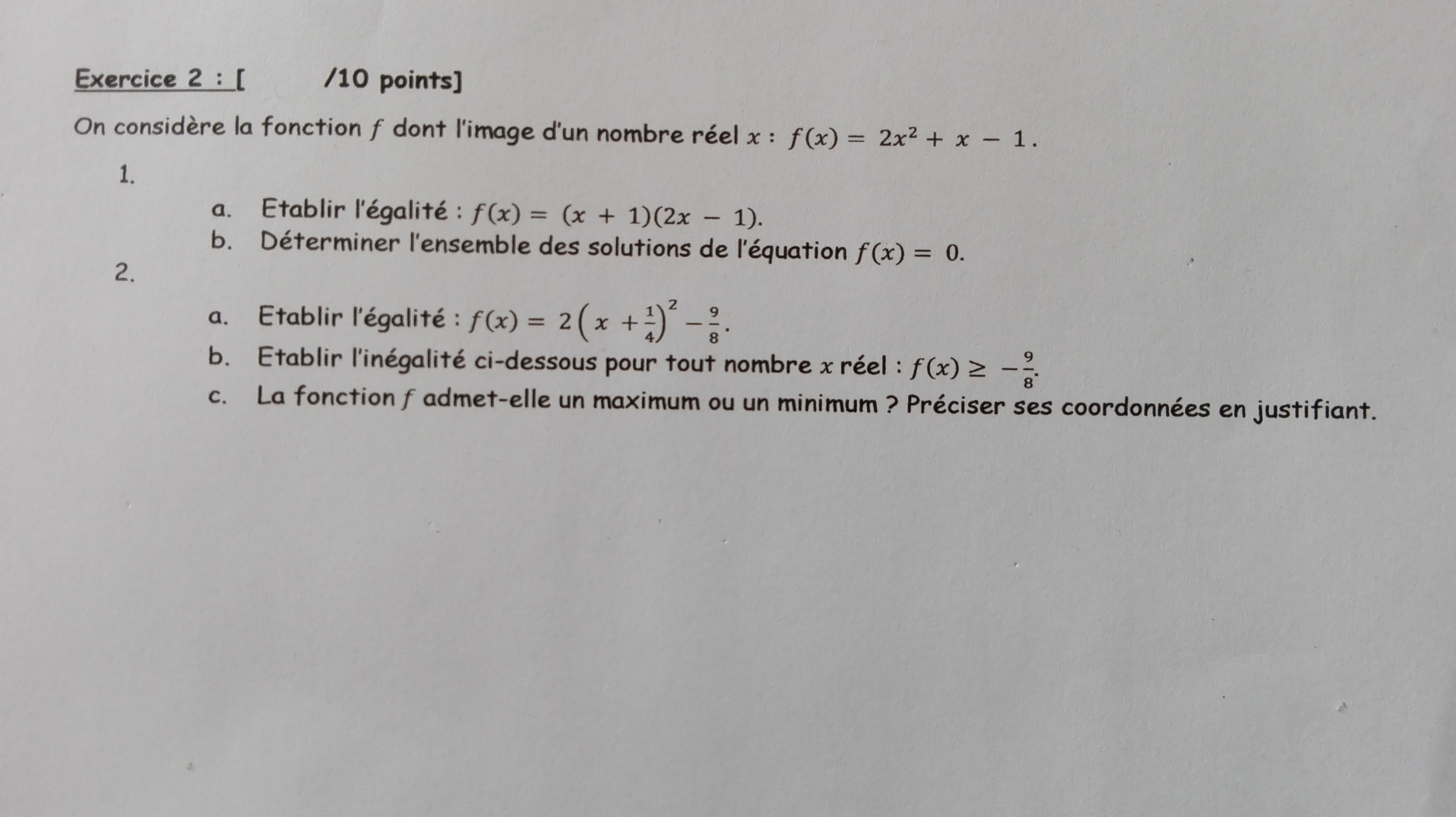 E-Bahut pzorba75 Posté(e) le 24 mars 2016 E-Bahut Signaler Posté(e) le 24 mars 2016 Pour le 2, question 1 tu développes tout simplement, question 2 un produit de facteurs est nul si un de secs facteurs est nul. question 2 a) tu développes b) tu réfléchis un carré est positif ou nul, donc c) évident quand tu as répondu à 2b. Au travail, l'urgence c'est un prétexte inutile sur ce forum.
